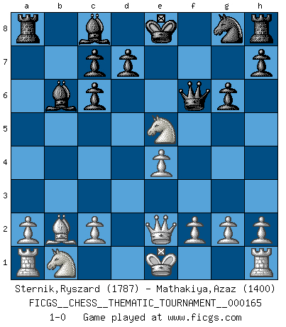 Last move : 1-0 2013 August 14 17:36:23 [Event "FICGS__CHESS__THEMATIC_TOURNAMENT__000165"] [Site "FICGS"] [Date "2013.07.25"] [Round "1"] [White "Sternik,Ryszard"] [Black "Mathakiya,Azaz"] [Result "1-0"] [WhiteElo "1787"] [BlackElo "1400"] 1.b4 e5 2.Bb2 f6 3.b5 a6 4.e4 Bc5 5.Nf3 axb5 6.d4 Bb6 7.Bxb5 Nc6 8.dxe5 fxe5 9.Bxc6 bxc6 10.Nxe5 Qf6 11.Qh5+ g6 12.Qe2 1-0 Polish (Sokolsky) opening Player White won this chess game. Follow this game move after move (download)Pawns: they are the soul of this game, they alone form the attack and defense. (Philidor) Glücklicherweise sind Großmeister Ruben Fines reine Schachbücher weniger phallozentrisch [als seine Schachpsychologie] und deswegen auch weniger lächerlich. (Nigel Short) Una mala movida nulifica cuarenta buenas. (Horowitz) Seul un grand joueur sait à quel point il joue faiblement. (Xavier Tartacover) Before all elsed, be armed. (Niccolo Machiavelli)