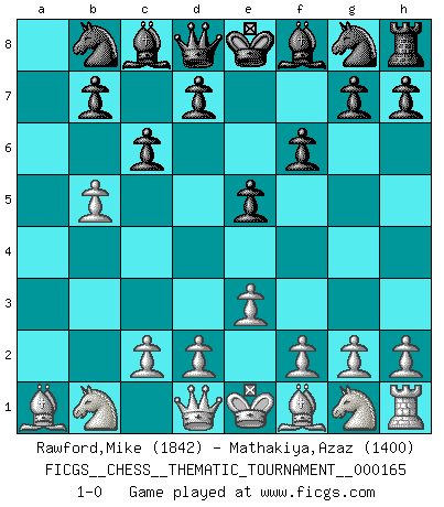 Last move : 1-0 2013 August 17 19:57:59 [Event "FICGS__CHESS__THEMATIC_TOURNAMENT__000165"] [Site "FICGS"] [Date "2013.07.25"] [Round "1"] [White "Rawford,Mike"] [Black "Mathakiya,Azaz"] [Result "1-0"] [WhiteElo "1842"] [BlackElo "1400"] 1.b4 e5 2.Bb2 f6 3.b5 a6 4.a4 axb5 5.axb5 Rxa1 6.Bxa1 c6 7.e3 1-0 Polish (Sokolsky) opening Player White won this chess game. Follow this game move after move (download)When you play Bobby, it is not a question if you win or lose. It is a question if you survive. (Boris Spassky) Wenn Capablanka heute auf der Schachbühne erscheinen würde, hätte er ein halbes Jahr gebraucht um sich die Schachtheorie anzueignen. Und dann hätte er alles und jeden besiegt. (Mikhail Moiseyevich Botvinik) En el Ajedrez, cuando menos, el valiente hereda la tierra. (Edmar Mednis) Le système Elo représente seulement une moyenne. Il est simplement un indicateur de votre stabilité. (Anatoli Karpov) Thus, what is of supreme importance in war is to attack the enemy's strategy. (Sun Tzu)