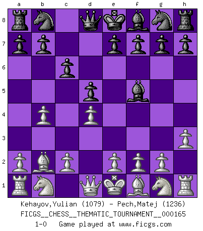 Last move : 1-0 2013 September 5 1:52:26 [Event "FICGS__CHESS__THEMATIC_TOURNAMENT__000165"] [Site "FICGS"] [Date "2013.07.25"] [Round "1"] [White "Kehayov,Yulian"] [Black "Pech,Matej"] [Result "1-0"] [WhiteElo "1079"] [BlackElo "1236"] 1.b4 c6 2.Bb2 d5 3.d4 Bf5 4.h3 1-0 Polish : Outflank variation Player White won this chess game. Follow this game move after move (download)In Chess, at least, the brave inherit the earth. (Edmar Mednis) Oft bringt ein stiller Zug das Erdbeben. (Richard Reti) Uno no tiene que jugar muy bien, es suficiente jugar mejor que el oponente. (Siegbert Tarrasch) Ce n'est pas pour s'amuser qu'il joue aux échecs : il célèbre un culte. (Vladimir Nabokov) Horse racing is animated roulette. (Roger Kahn)