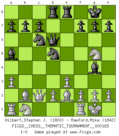Last move : 1-0 2013 October 23 5:12:31 [Event "FICGS__CHESS__THEMATIC_TOURNAMENT__000165"] [Site "FICGS"] [Date "2013.07.25"] [Round "1"] [White "Hilbert,Stephan J."] [Black "Rawford,Mike"] [Result "1-0"] [WhiteElo "1800"] [BlackElo "1842"] 1.b4 e5 2.Bb2 Bxb4 3.Bxe5 Nf6 4.c4 O-O 5.a3 Ba5 6.Nf3 d5 7.cxd5 Nxd5 8.e3 Nc6 9.Bb2 Qd6 10.Qc2 Bg4 11.Be2 Rfe8 12.O-O Rad8 13.Ng5 1-0 This chess game has been lost on time (started : 2013.07.25 16:50:14) Polish (Sokolsky) opening Kingside Castling by player Black (move 4) Kingside Castling by player White (move 12) Player White won this chess game. Follow this game move after move (download)Chess is a matter of delicate judgment, knowing when to punch and how to duck. (Bobby Fischer) Es war undenkbar für die Behörden, dass ein sowjetischer Großmeister auf diese Art und Weise [Fischer-Taimanov 6:0] verliert, ohne dass es eine politischer Erklärung dafür gäbe. (Mark Taimanov) Realmente no sabemos como el juego fue inventado, aunque hay sospechas. Tan pronto como descubramos a los culpables, se los haremos saber. (Bruce Pandolfini) Avec des compensations pour le matériel en plus... (Anonyme) Locking firmely the window serves nothing, only small thiefs pass through there, the big thiefs enter through the front door. (Luc-Olivier Leclerc)