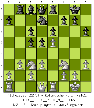 Last move : 1/2-1/2 2013 August 30 18:19:9 [Event "FICGS__CHESS__RAPID_M__000065"] [Site "FICGS"] [Date "2013.07.26"] [Round "1"] [White "Nichols,Scott"] [Black "Kolomytchenko,Igor"] [Result "1/2-1/2"] [WhiteElo "2270"] [BlackElo "2162"] 1.e4 c5 2.Nc3 Nc6 3.Bb5 e6 4.Bxc6 bxc6 5.d3 d5 6.Nf3 Nf6 7.O-O Be7 8.Bg5 h6 9.Bh4 O-O 10.Re1 Rb8 11.b3 Re8 12.h3 Nd7 13.Bxe7 Rxe7 14.e5 Re8 1/2-1/2 Sicilian : Closed, 2...Nc6 Kingside Castling by player White (move 7) Kingside Castling by player Black (move 9) This chess game ended in a draw. Follow this game move after move (download)There is no remorse like the remorse of Chess. (H. G. Wells) Der Verteidiger gebe der Gewalt nach, aber nur der Gewalt. Er schaffe sich nicht freiwillig, etwa aus Blindheit oder aus Schrecken, irgendwelche Schwächen. Er lasse sich nicht bluffen. (Emanuel Lasker) El Ajedrez es el gimnasio de la mente. (Blaise Pascal) Il n'y a pas de prix trop élevé au scalp de l'ennemi. (Koblentz) Perseverance does not equal worthiness. Next time you want to get my attention, wear something fun. Low-riding jeans are hot. (Gregory House, House M.D.)
