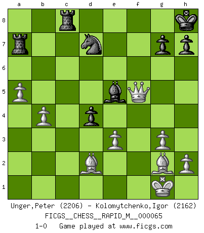 Last move : 1-0 2013 September 29 3:5:36 [Event "FICGS__CHESS__RAPID_M__000065"] [Site "FICGS"] [Date "2013.07.26"] [Round "1"] [White "Unger,Peter"] [Black "Kolomytchenko,Igor"] [Result "1-0"] [WhiteElo "2206"] [BlackElo "2162"] 1.d4 Nf6 2.Nf3 e6 3.c4 d5 4.Nc3 c6 5.e3 Nbd7 6.Bd3 dxc4 7.Bxc4 b5 8.Bd3 a6 9.e4 c5 10.e5 cxd4 11.Nxb5 Nxe5 12.Nxe5 axb5 13.Bxb5+ Bd7 14.Nxd7 Nxd7 15.O-O Bc5 16.b4 Bb6 17.a4 O-O 18.Bf4 e5 19.Bd2 Bc7 20.Bc6 Ra7 21.g3 Nb8 22.Bg2 f5 23.Qb3+ Kh8 24.a5 e4 25.Rac1 Qf6 26.Rc4 Qe6 27.Rfc1 Be5 28.Rc8 Qxc8 29.Rxc8 Rxc8 30.Qe6 Nd7 31.Qxf5 e3 32.fxe3 1-0 This chess game has been lost on time (started : 2013.07.26 12:13:58) Queen's pawn game Kingside Castling by player White (move 15) Kingside Castling by player Black (move 17) Player White won this chess game. Follow this game move after move (download)The tactician knows what to do when there is something to do; whereas the strategian knows what to do when there is nothing to do. (Gerald Abrahams) Mit sehr nachdenklichem Gesicht schreitet Bobby durch den Turniersaal. Was ist passiert?, fragt Lombardy. Ich stehe schlecht, antwortet Fischer. Lombardy: Dann biete doch einfach Remis an. Fischer: So schlecht stehe ich nun auch wieder nicht! (Robert James Fischer) Me dio la sensación de como si yo estuviera jugando en contra del mismo Ajedrez. - al estar jugando en contra de Robert Fischer (Walter Shipman) Les Echecs ont trois composantes : le temps, l'espace et le matériel en dernier. (Mikhail Tal) Luck is what you have left over after you give 100 percent. (Langston Coleman)