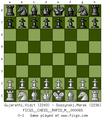 Last move : 0-1 2013 August 25 12:36:37 [Event "FICGS__CHESS__RAPID_M__000065"] [Site "FICGS"] [Date "2013.07.26"] [Round "1"] [White "Gujarathi,Vidit"] [Black "Soszynski,Marek"] [Result "0-1"] [WhiteElo "2243"] [BlackElo "2236"] 0-1 This chess game has been lost on time (started : 2013.07.26 12:13:58) Player Black won this chess game. Follow this game move after move (download)A sacrifice is best refuted by accepting it. (Wilhelm Steinitz) Kasparov stellt für gewöhnlich die Regeln auf und bricht sie dann selbst wieder. (Alexej Shirov) Cuando tengo las piezas blancas, yo gano porque soy blanco; Cuando tengo las piezas negras, yo gano porque soy Bogolyubov. (Bogolyubov) Il vaut toujours mieux jouer un plan faux de façon logique que de n'avoir pas de plan du tout. (Victor Kortchnoï) When it is a question of money, everybody is of the same religion. (Voltaire)