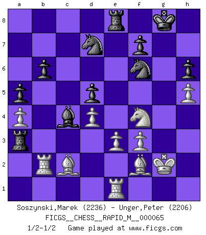 Last move : 1/2-1/2 2013 August 8 12:34:8 [Event "FICGS__CHESS__RAPID_M__000065"] [Site "FICGS"] [Date "2013.07.26"] [Round "1"] [White "Soszynski,Marek"] [Black "Unger,Peter"] [Result "1/2-1/2"] [WhiteElo "2236"] [BlackElo "2206"] 1.d4 Nf6 2.c4 e6 3.Nc3 Bb4 4.Qc2 O-O 5.a3 Bxc3+ 6.Qxc3 b6 7.Bg5 Bb7 8.f3 h6 9.Bh4 d5 10.e3 Re8 11.Nh3 Nbd7 12.cxd5 exd5 13.Be2 c5 14.O-O Qe7 15.Bf2 c4 16.Bd1 a5 17.Ba4 Ba6 18.Bc2 Qd6 19.Rfe1 Bb7 20.b3 Rac8 21.Nf4 cxb3 22.Qxb3 Ba6 23.Qb2 Bc4 24.a4 Ba6 25.Rac1 Qb4 26.Rb1 Qxb2 27.Rxb2 Rc3 28.h4 g6 29.g4 Bc4 30.h5 gxh5 31.gxh5 Ra3 32.Kg2 1/2-1/2 Nimzo-Indian : Classical variation Kingside Castling by player Black (move 4) Kingside Castling by player White (move 14) This chess game ended in a draw. Follow this game move after move (download)On the chessboard, lies and hypocrisy do not survive long. (Emanuel Lasker) Mein Name ist Rustam Kamsky. Sie haben meinen Sohn belästigt. Bereiten Sie sich aufs Sterben vor. (Rustam Kamsky) Yo siempre he tenido un ligero sentimiento de lástima por una persona que no tiene conocimiento del Ajedrez. (Siegbert Tarrasch) En blitz, le Cavalier l'emporte sur le Fou. (Vlastimil Hort) Pushing plastic is for the many, pushing virtual pieces is for the fewer, pushing wood is for the very few. (Normajean Yates)