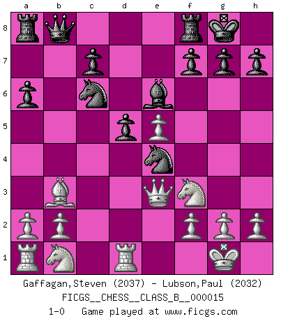 Last move : 1-0 2007 April 17 5:17:12 [Event "FICGS__CHESS__CLASS_B__000015"] [Site "FICGS"] [Date "2007.02.05"] [Round "1"] [White "Gaffagan,Steven"] [Black "Lubson,Paul"] [Result "1-0"] [WhiteElo "2037"] [BlackElo "2032"] 1.e4 e5 2.Nf3 Nc6 3.Bb5 a6 4.Ba4 Nf6 5.O-O Nxe4 6.d4 b5 7.Bb3 d5 8.dxe5 Be6 9.Qe2 Be7 10.Rd1 O-O 11.c4 bxc4 12.Bxc4 Bc5 13.Be3 Bxe3 14.Qxe3 Qb8 15.Bb3 1-0 Ruy Lopez : Open, 7.Bb3 Kingside Castling by player White (move 5) Kingside Castling by player Black (move 10) Player White won this chess game. Follow this game move after move (download)First-class players lose to second class players because second-class players sometimes play a first-class game. (Tarrasch) Die FIDE ist dabei in die Hände der russischen Mafia zu fallen. (Larry Evans) No es tiempo de jugar al Ajedrez cuando la casa esta en llamas. (Proverbio Italiano) Il a essayé de se convaincre qu'il pourrait empêcher toutes les erreurs et ne jamais perdre. L'horreur ! Gary Kasparov au sujet de Robert Fischer. When you have everything, sometimes it feels like nothing. (Horatio Caine, C.S.I. Miami)