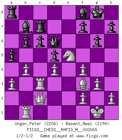 Last move : 1/2-1/2 2013 September 23 16:29:38 [Event "FICGS__CHESS__RAPID_M__000065"] [Site "FICGS"] [Date "2013.07.26"] [Round "1"] [White "Unger,Peter"] [Black "Basant,Neel"] [Result "1/2-1/2"] [WhiteElo "2206"] [BlackElo "2194"] 1.d4 e6 2.Nf3 Nf6 3.c4 b6 4.Nc3 Bb7 5.a3 d5 6.Bg5 Be7 7.Qa4+ Nbd7 8.Bxf6 Bxf6 9.cxd5 exd5 10.g3 O-O 11.Bh3 Nb8 12.O-O Na6 13.b4 c6 14.e3 Nc7 15.Rfc1 Ne6 16.Rab1 g6 17.Ne2 Qd6 18.Rc3 Rfc8 19.Nf4 Nxf4 20.exf4 Rc7 21.Qc2 Bg7 22.Bg2 Bf8 23.Ne5 a5 24.Bf3 1/2-1/2 Queen's pawn Kingside Castling by player Black (move 10) Kingside Castling by player White (move 12) This chess game ended in a draw. Follow this game move after move (download)Is Bobby Fischer quite sane ? (Salo Flohr) Wenn Schach ein enormer Dschungel ist, der seine Myriaden von Geheimnissen nicht preisgeben will, dann sind Computer die Kettensägen einer gewaltigen ökologisch unsensiblen Nutzholzfirma. (Nigel Short) Antes de los Finales, los dioses han colocado el Juego Medio. (Siegbert Tarrasch) Shah mat. Le roi est mort. Cri de fierté d'un joueur venant de terrasser son adversaire, courtoisement, sans effusion de sang. Knowledge rests not upon truth alone, but upon error also. (Carl G. Jung)