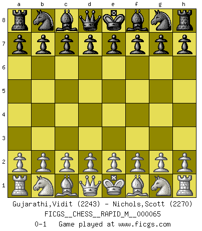 Last move : 0-1 2013 August 25 12:36:37 [Event "FICGS__CHESS__RAPID_M__000065"] [Site "FICGS"] [Date "2013.07.26"] [Round "1"] [White "Gujarathi,Vidit"] [Black "Nichols,Scott"] [Result "0-1"] [WhiteElo "2243"] [BlackElo "2270"] 0-1 This chess game has been lost on time (started : 2013.07.26 12:13:58) Player Black won this chess game. Follow this game move after move (download)I like the moment when I break a man's ego. (Bobby Fischer) Es gibt Leute, die glauben, alles wäre vernünftig, was man mit einem ernsthaften Gesicht tut. (Georg Christoph Lichtenberg) Para mi, el Ajedrez es la vida y cada partida es como una nueva vida. Todo jugador de Ajedrez suele vivir muchas vidas durante su vida. (Eduard Gufeld) Tous ces prétendus hommes politiques sont les pions, les Cavaliers, les Tours ou les Fous d'une partie d'échecs qui se jouera tant qu'un hasard ne renversera pas l'échiquier. (Honoré de Balzac) Two beer, or not two beer. (Unknown)