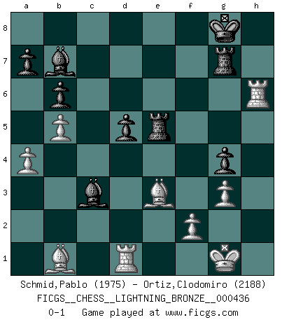 Last move : 0-1 2013 July 28 2:42:53 [Event "FICGS__CHESS__LIGHTNING_BRONZE__000436"] [Site "FICGS"] [Date "2013.07.28"] [Round "1"] [White "Schmid,Pablo"] [Black "Ortiz,Clodomiro"] [Result "0-1"] [WhiteElo "1975"] [BlackElo "2188"] 1.d4 Nf6 2.Nf3 d5 3.c4 e6 4.g3 Be7 5.Bg2 O-O 6.O-O Nbd7 7.Qc2 c6 8.Nbd2 b6 9.e4 Bb7 10.e5 Ne8 11.cxd5 cxd5 12.Re1 Rc8 13.Qa4 Nc7 14.Bf1 h6 15.Bd3 Qe8 16.Bb1 f5 17.exf6 Rxf6 18.a3 Bd6 19.b4 Qf7 20.Ra2 Rd8 21.Qc2 Nf8 22.Qb3 g5 23.Rc2 Rd7 24.h3 Qh5 25.Kg2 g4 26.hxg4 Qxg4 27.Nh2 Qh5 28.Ndf3 Rdf7 29.b5 Nh7 30.a4 Ng5 31.Nxg5 hxg5 32.Qe3 Rg7 33.Qe2 g4 34.Rh1 e5 35.Nf1 Qf7 36.dxe5 Re6 37.Kg1 Bxe5 38.Rh6 Re8 39.Qd1 Ne6 40.Nh2 Nd4 41.Rd2 Nf3+ 42.Nxf3 Qxf3 43.Rd3 Qxd1+ 44.Rxd1 Bc3 45.Be3 Re5 0-1 Queen's pawn game Kingside Castling by player Black (move 5) Kingside Castling by player White (move 6) Player Black won this chess game. Follow this game move after move (download)Chess is a part of culture and if a culture is declining then Chess too will decline. (Mikhail Botvinnik) Frage des Reporters: -Welche besonderen Umstände rechtfertigen das Anhalten der Uhren während einer Turnierpartie? Antwort: -Einen Fotographen zu strangulieren. (Siegbert Tarrasch) Cuando tengo las piezas blancas, yo gano porque soy blanco; Cuando tengo las piezas negras, yo gano porque soy Bogolyubov. (Bogolyubov) Toutes les manuvres exécutées sur une colonne ouverte ont pour but ultime l'intrusion définitive sur la septième ou la huitième rangée, en plein cur de la position ennemie. (Aaron Nimzovitch) Rules and bones are meant to be broken. (Anonymous)