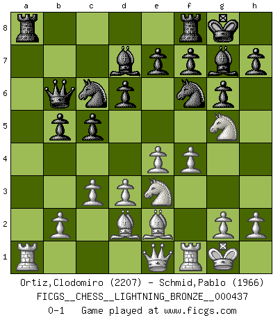 Last move : 0-1 2013 July 28 4:18:10 [Event "FICGS__CHESS__LIGHTNING_BRONZE__000437"] [Site "FICGS"] [Date "2013.07.28"] [Round "1"] [White "Ortiz,Clodomiro"] [Black "Schmid,Pablo"] [Result "0-1"] [WhiteElo "2207"] [BlackElo "1966"] 1.f4 g6 2.e4 Bg7 3.Nf3 c5 4.Be2 d6 5.O-O Nf6 6.d3 O-O 7.a4 Nc6 8.Na3 a6 9.Bd2 Rb8 10.c3 Be6 11.Ng5 Bd7 12.Nc4 b5 13.axb5 axb5 14.Ne3 Qb6 15.Qe1 Ra8 0-1 This chess game has been lost on time (started : 2013.07.28 2:45:11) Bird's Opening Kingside Castling by player White (move 5) Kingside Castling by player Black (move 6) Player Black won this chess game. Follow this game move after move (download)Nothing excites jaded Grandmasters more than a theoretical novelty. (Dominic Lawson) Schach ist das schnellste Spiel der Welt, weil man in jeder Sekunde Tausende von Gedanken ordnen muß. (Albert Einstein) Solo puedes ser bueno en el Ajedrez si amas al juego. (Bobby Fischer) Il n'y a pas de prix trop élevé au scalp de l'ennemi. (Koblentz) God, you are such an idiot. - Actually, I thought I was more of a jerk. (Gregory House to Stacy Warner, House M.D.)