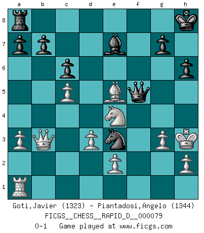 Last move : 0-1 2013 September 5 0:18:2 [Event "FICGS__CHESS__RAPID_D__000079"] [Site "FICGS"] [Date "2013.07.28"] [Round "1"] [White "Goti,Javier"] [Black "Piantadosi,Angelo"] [Result "0-1"] [WhiteElo "1323"] [BlackElo "1344"] 1.c4 e5 2.Nc3 Nf6 3.g3 d6 4.Bg2 Be7 5.d3 O-O 6.Nf3 c6 7.O-O Be6 8.Ng5 h6 9.Nxe6 fxe6 10.f4 exf4 11.Bxf4 e5 12.Bc1 Nbd7 13.a3 Nb6 14.b3 d5 15.Bb2 dxc4 16.bxc4 Ng4 17.Rxf8+ Qxf8 18.Ne4 Ne3 19.Qb3 Nxg2 20.c5 Nd5 21.Kxg2 Kh8 22.Bxe5 Ne3+ 23.Kh3 Qf5+ 0-1 English : Carls' Bremen system Kingside Castling by player Black (move 5) Kingside Castling by player White (move 7) Player Black won this chess game. Follow this game move after move (download)Via the squares on the chessboard, the Indians explain the movement of time and the age, the higher influences which control the world and the ties which link Chess with the human soul. (Al-Masudi) Ich hatte Zahnschmerzen im ersten Spiel. In der zweiten Partie tat mir der Kopf weh. In der dritten war es eine Rheuma-Attacke und während der vierten fühlte ich mich nicht gut. Und in der fünften? Nun, man muss doch nicht jedes Spiel gewinnen, oder? (Savielly Grigorievitsch Tartakower) Debes de llevar a tu oponente hacia un profundo y obscuro bosque donde 2+2=5, y el camino que conduce a la salida es suficientemente ancho para solamente uno. (Mikhail Tal) Donnez-moi un Cavalier en 6e et je gagnerais toutes mes parties. (Steinitz) Always be a first-rate version of yourself, instead of a second-rate version of somebody else. (Judy Garland)