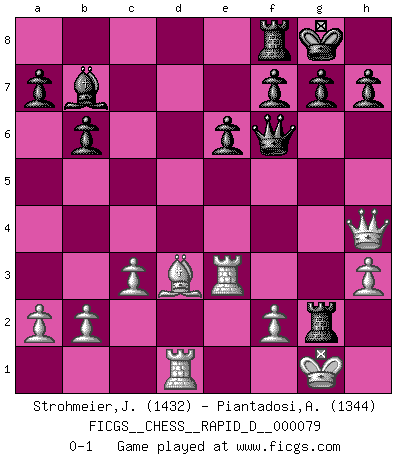 Last move : 0-1 2013 October 8 23:25:57 [Event "FICGS__CHESS__RAPID_D__000079"] [Site "FICGS"] [Date "2013.07.28"] [Round "1"] [White "Strohmeier,Josef"] [Black "Piantadosi,Angelo"] [Result "0-1"] [WhiteElo "1432"] [BlackElo "1344"] 1.e4 e6 2.d4 d5 3.Nc3 dxe4 4.Nxe4 Nd7 5.Nf3 Ngf6 6.Bd3 Be7 7.O-O O-O 8.Nxf6+ Nxf6 9.h3 b6 10.c3 Bb7 11.Ne5 c5 12.Be3 cxd4 13.Bxd4 Rc8 14.Qe2 Bc5 15.Bxc5 Rxc5 16.Rad1 Qc7 17.Ng4 Nxg4 18.Qxg4 Qe5 19.Rfe1 Qf6 20.Re3 Rg5 21.Qh4 Rxg2+ 0-1 French : Rubinstein variation Kingside Castling by player White (move 7) Kingside Castling by player Black (move 7) Player Black won this chess game. Follow this game move after move (download)Of all my Russian books, the defense contains and diffuses the greatest 'warmth' which may seem odd seeing how supremely abstract Chess is supposed to be. (Vladimir Nabokov) Die Fehler sind da, Sie warten nur darauf gemacht zu werden. (Savielly Grigorievitsch Tartakower) Hay dos clases de hombres: aquellos que se conforman en dejarse llevar por las circunstancias y que juegan barajas y aquellos decididos a controlar las circunstancias y que juegan al Ajedrez. (Mortimer Collins) Je ne suis pas le dernier à jouer lâchement des coups douteux pendant le zeïtnot de l'adversaire pour l'achever: en effet les coups qui font le plus peur sont ceux que l'on ne comprend pas. Je me fais souvent peur quand je joue. (Un professeur anonyme) Chess, like love, like music, has the power to make people happy. (Siegbert Tarrasch)