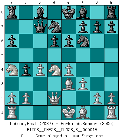 Last move : 0-1 2007 April 19 17:48:27 [Event "FICGS__CHESS__CLASS_B__000015"] [Site "FICGS"] [Date "2007.02.05"] [Round "1"] [White "Lubson,Paul"] [Black "Porkolab,Sandor"] [Result "0-1"] [WhiteElo "2032"] [BlackElo "2000"] 1.e4 c5 2.Nf3 d6 3.d4 cxd4 4.Nxd4 Nf6 5.Nc3 a6 6.Be3 e6 7.f3 b5 8.Qd2 b4 9.Na4 Nbd7 10.c4 Qc7 0-1 Sicilian : Najdorf, Byrne (English) attack Player Black won this chess game. Follow this game move after move (download)I am the best player in the world and I am here to prove it. (Bobby Fischer) Deine Wertungszahl - vorausgesetzt einige Jahre schachliche Anstrengung - entspricht etwa dem zehnfachen Deines IQ plus 1000. (Jonathan Levitt) Debemos de asegurarnos de que el Ajedrez no se convierta en un lenguaje muerto, muy interesante, pero tan solo para un grupo muy pequeño. (Sytze Faber) Les réformistes prétendent que les progrès de la théorie conduiront à la disparition des échecs, et qu'il faut, pour leur rendre vie, en remanier les règles. En réalité, qu'exprime cette affirmation? Le mépris de l'intuition, de l'imagination et de tous les autres éléments qui font des échecs un art. (Alexander Alekhine) Nowadays, anyone who cannot speak English and is incapable of using the Internet is regarded as backward. (Al-Waleed bin Talal)