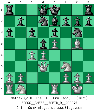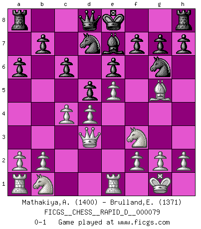 Last move : 0-1 2013 August 14 17:36:35 [Event "FICGS__CHESS__RAPID_D__000079"] [Site "FICGS"] [Date "2013.07.28"] [Round "1"] [White "Mathakiya,Azaz"] [Black "Brulland,Emmanuel"] [Result "0-1"] [WhiteElo "1400"] [BlackElo "1371"] 1.e4 c6 2.Nf3 d5 3.e5 Bf5 4.d4 e6 5.Bd3 Bxd3 6.Qxd3 a6 7.O-O Ne7 8.Re1 Ng6 9.c4 Nd7 10.Bg5 Be7 0-1 Caro-Kann defense Kingside Castling by player White (move 7) Player Black won this chess game. Follow this game move after move (download)Adequate compensation for a sacrifice is having a sound combination leading to a winning position; adequate compensation for a blunder is having your opponent snatch defeat from the jaws of victory. (Bruce A. Moon) Die Arbeit ist etwas Unnatürliches. Die Faulheit allein ist göttlich. (Anatole France) El Ajedrez es en su esencia, un juego. En su forma, un arte. Y en su ejecución, una ciencia. (Baron Tassilo) Le jeu d'échecs est comme rejeté hors du temps. (Antoine de Saint-Exupéry) The quality of decision is like the well-timed swoop of a falcon which enables it to strike and destroy its victim. (Sun Tzu)