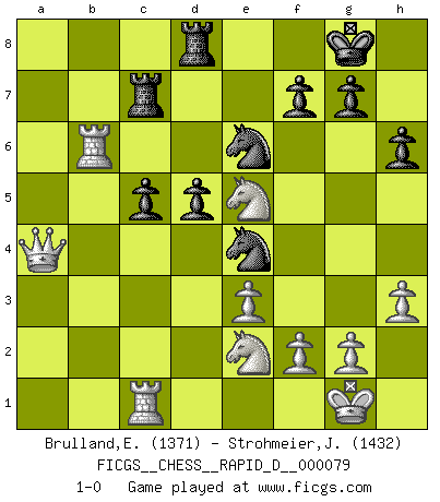Last move : 1-0 2013 October 29 20:17:19 [Event "FICGS__CHESS__RAPID_D__000079"] [Site "FICGS"] [Date "2013.07.28"] [Round "1"] [White "Brulland,Emmanuel"] [Black "Strohmeier,Josef"] [Result "1-0"] [WhiteElo "1371"] [BlackElo "1432"] 1.c4 Nf6 2.d4 e6 3.a3 d5 4.e3 Be7 5.Nc3 O-O 6.Nf3 c6 7.cxd5 exd5 8.Be2 Bd6 9.O-O h6 10.Re1 Re8 11.Qc2 Nbd7 12.h3 Nf8 13.Bd3 Bd7 14.Na4 b6 15.Nc3 Rc8 16.b4 c5 17.dxc5 bxc5 18.b5 Rb8 19.a4 Qa5 20.Bd2 Qc7 21.Bf5 Be6 22.Bxe6 Nxe6 23.Red1 Red8 24.Bc1 Be7 25.Ne2 Ne4 26.Bb2 Bf6 27.Bxf6 Nxf6 28.Rdc1 Rbc8 29.Ra2 Ne4 30.Rb2 Qa5 31.Ne5 Qxa4 32.Qxa4 Rc7 33.b6 axb6 34.Rxb6 1-0 English, 1...Nf6 (Anglo-Indian defense) Kingside Castling by player Black (move 5) Kingside Castling by player White (move 9) Player White won this chess game. Follow this game move after move (download)For me, Chess is life and every game is like a new life. Every Chess player gets to live many lives in one lifetime. (Eduard Gufeld) Stelle das Brett so, daß die Sonne in die Augen deines Gegners scheint. (Ruy López) El Ajedrez hace al hombre ser mas sabio y ver mas claro. (Vladimir Putin) Aux échecs, les retours au sommet sont rares : les dommages psychologiques consécutifs à une défaite sont trop sévères. (Daily Telegraph) Internal peace cannot coexist with external war. (Don Groves)