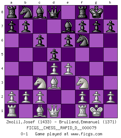 Last move : 0-1 2013 September 4 1:17:12 [Event "FICGS__CHESS__RAPID_D__000079"] [Site "FICGS"] [Date "2013.07.28"] [Round "1"] [White "Zmolil,Josef"] [Black "Brulland,Emmanuel"] [Result "0-1"] [WhiteElo "1433"] [BlackElo "1371"] 1.e4 c6 2.d4 d5 3.Nc3 e6 4.Nf3 Nf6 5.Bd3 Be7 6.O-O O-O 0-1 This chess game has been lost on time (started : 2013.07.28 12:22:8) Caro-Kann defense Kingside Castling by player White (move 6) Kingside Castling by player Black (move 6) Player Black won this chess game. Follow this game move after move (download)A Chess game is divided into three stages: the first, when you hope you have the advantage, the second when you believe you have an advantage, and the third... when you know you're going to lose ! (Savielly Tartakower) Schach ist eine Sache der genauen Beurteilung, wann man zuschlagen und wann man sich ducken muss. (Robert James Fischer) Una partida de Ajedrez se divide en 3 etapas: la primera cuando piensas que tienes la ventaja, la segunda cuando crees que tienes la ventaja y la tercera... ¡cuando te das cuenta que vas a perder!. (Savielly Tartakower) Toutes les manuvres exécutées sur une colonne ouverte ont pour but ultime l'intrusion définitive sur la septième ou la huitième rangée, en plein cur de la position ennemie. (Aaron Nimzovitch) At work, the authority of a person is inversely proportional to the number of pens that person is carrying. (Dan Rotaru)