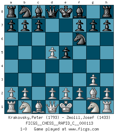 Last move : 1-0 2013 September 5 1:48:53 [Event "FICGS__CHESS__RAPID_C__000113"] [Site "FICGS"] [Date "2013.07.29"] [Round "1"] [White "Krakovsky,Peter"] [Black "Zmolil,Josef"] [Result "1-0"] [WhiteElo "1793"] [BlackElo "1433"] 1.c4 e5 2.g3 Nf6 3.Bg2 d5 4.cxd5 1-0 English Opening Player White won this chess game. Follow this game move after move (download)It's always better to sacrifice your opponent's men. (Savielly Tartakover) Auf Remis zu spielen ist gewissermaßen ein Verbrechen gegen das Schachspiel. (Mikhail Nekhemyevich Tal) Un jugador que trata de regresar una movida en el Ajedrez es un futuro carterista. (Richard Fenton) Horreur, mais aussi harmonie suprême : qu'y avait-il en effet au monde en dehors des échecs ? Le brouillard, l'inconnu, le non-être... (Vladimir Nabokov) A good player is always lucky. (Capablanca)