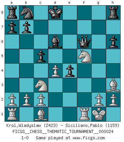Last move : 1-0 2007 July 22 20:49:16 [Event "FICGS__CHESS__THEMATIC_TOURNAMENT__000024"] [Site "FICGS"] [Date "2007.02.05"] [Round "1"] [White "Krol,Wladyslaw"] [Black "Siciliano,Pablo"] [Result "1-0"] [WhiteElo "2423"] [BlackElo "1159"] 1.e4 c5 2.f4 d5 3.Nf3 dxe4 4.Ng5 Nf6 5.Bc4 Bg4 6.Bxf7+ Kd7 7.Qxg4+ Nxg4 8.Be6+ Ke8 9.Bf7+ Kd7 10.Be6+ Ke8 11.Bxg4 e5 12.O-O exf4 13.Ne6 Qh4 14.Rxf4 Qe1+ 15.Rf1 Qh4 16.Bh3 Bd6 17.d4 h6 18.Nxg7+ Kd8 19.Nf5 Qf6 20.Nc3 1-0 Sicilian : Grand Prix attack Kingside Castling by player White (move 12) Player White won this chess game. Follow this game move after move (download)The boy (then a 12 year old boy named Anatoly Karpov) doesn't have a clue about Chess, and there's no future at all for him in this profession. (Mikhail Botvinnik) Ich würde mich als ganz normalen Jungen bezeichnen [Im Alter von 12]. (Sergej Karjakin) El Peón aislado arroja penumbra sobre todo el tablero. (Aaron Nimzovich) Les Echecs ont trois composantes : le temps, l'espace et le matériel en dernier. (Mikhail Tal) We cannot be sure of having something to live for unless we are willing to die for it. (Ernesto Che Guevara)