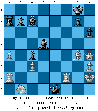 Last move : 0-1 2013 August 23 5:49:9 [Event "FICGS__CHESS__RAPID_C__000113"] [Site "FICGS"] [Date "2013.07.29"] [Round "1"] [White "Kuge,Tom"] [Black "Munoz Portugal,Guillermo"] [Result "0-1"] [WhiteElo "1606"] [BlackElo "1710"] 1.e4 c5 2.a3 Nc6 3.b4 e5 4.b5 Nd4 5.c3 Ne6 6.Nf3 Nf6 7.Qc2 d5 8.d3 Bd6 9.Bg5 Nxg5 10.Nxg5 a6 11.exd5 Nxd5 12.Ne4 axb5 13.d4 c4 14.Be2 Bc7 15.dxe5 O-O 16.O-O Qe7 17.Ng3 Qxe5 18.a4 Nf4 19.Bf3 b4 20.Nd2 b3 21.Qe4 Be6 22.Nb1 Ra7 23.Re1 Nd3 24.Rd1 Rfa8 25.Qh4 Bb6 26.Nh1 f5 27.Rf1 b2 28.Ra2 h6 29.g4 fxg4 30.Bxg4 Bd5 31.Nd2 Rf8 32.h3 Nxf2 33.Nxf2 Rxf2 34.Rxf2 b1=Q 35.Nxb1 Qe1 36.Kh2 Bc7 0-1 Sicilian defense Kingside Castling by player Black (move 15) Kingside Castling by player White (move 16) Promotion Queen by player Black (move 34) Player Black won this chess game. Follow this game move after move (download)It was clear to me that the vulnerable point of the American Grandmaster (Bobby Fischer) was in double-edged, hanging, irrational positions, where he often failed to find a win even in a won position. (Efim Geller) Sehr viele beherrschen heutzutage das große Einmalseins des Schachspiels und kennen sogar dessen Logarithmentafeln auswendig - deshalb sollte man hin und wieder zu beweisen trachten, dass zwei mal zwei auch fünf sein kann. (Mikhail Nekhemyevich Tal) Si un gobernante no entiende al Ajedrez, ¿como puede governar él un reinado?. (El Rey Khusros II) D'abord les bases : Jouez et étudiez, puis étudiez et jouez, ensuite jouez et étudiez, puis étudiez et jouez. Deuxièmement : Donnez toujours le meilleur de vous-même ! (Ken Smith) When you don't know what to do, walk fast and look worried. (Anonymous)