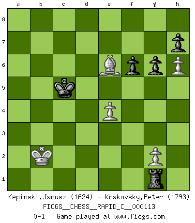 Last move : 0-1 2014 January 14 11:12:59 [Event "FICGS__CHESS__RAPID_C__000113"] [Site "FICGS"] [Date "2013.07.29"] [Round "1"] [White "Kepinski,Janusz"] [Black "Krakovsky,Peter"] [Result "0-1"] [WhiteElo "1624"] [BlackElo "1793"] 1.Nc3 d5 2.e4 d4 3.Nce2 e5 4.Nf3 Nc6 5.a3 Nf6 6.d3 Be6 7.c3 dxc3 8.Nxc3 Bc5 9.Be2 O-O 10.O-O Qe7 11.b4 Bb6 12.Na4 Bg4 13.Bb2 Rfd8 14.Rc1 Bxf3 15.Bxf3 Bd4 16.Nc3 Bxc3 17.Bxc3 Nd4 18.Bxd4 Rxd4 19.Qb3 c6 20.Rc5 Ne8 21.Rc4 Qe6 22.h3 g6 23.Qc2 Qd6 24.Rxd4 Qxd4 25.h4 Nc7 26.h5 a5 27.Qd2 axb4 28.Qxb4 Qxb4 29.axb4 Kg7 30.Bg4 Ra4 31.f4 exf4 32.Rxf4 Rxb4 33.h6+ Kf8 34.Rf2 Ke7 35.Bc8 c5 36.Ra2 b5 37.Kf2 Ra4 38.Rc2 Kd6 39.Ke3 Ra3 40.Kd2 f6 41.Rc1 b4 42.Rf1 Ke5 43.Rc1 Ra2+ 44.Ke3 Kd6 45.Rf1 Ke7 46.Rc1 b3 47.Rb1 Ra3 48.Bg4 Nb5 49.Rb2 Nc3 50.Bf3 Kd6 51.Kd2 Na4 52.Rb1 b2 53.Bg4 Ra1 54.Kc2 Ra3 55.Kd2 c4 56.dxc4 Kc5 57.Bd7 Ra1 58.Kc2 Nb6 59.Be6 Nxc4 60.Rxb2 Nxb2 61.Kxb2 Rg1 0-1 This chess game has been lost on time (started : 2013.07.29 6:16:42) Dunst (Sleipner, Heinrichsen) Opening Kingside Castling by player Black (move 9) Kingside Castling by player White (move 10) 10 pieces endgame at move 61 : White KBPPP , Black KRPPP WHITE : King + 1 Bishop 3 Pawns BLACK : King + 1 Rook 3 Pawns Player Black won this chess game. Follow this game move after move (download)The Chess pieces are the block alphabet which shapes thoughts; and these thoughts, although making a visual design on the chessboard, express their beauty abstractly, like a poem. (Marcel Duchamp) Mein Gehirn das ist mein zweitwichtigstes Organ [Aus dem Film: Der Schläfer]. (Woody Allen) Cada Peón es potencialmente una Reina. (James Mason) Les échecs, c'est la lutte contre l'erreur. (Johannes Zukertort) I believe in luck. How else can you explain the success of those you dislike ? (Jean Cocteau)