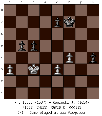 Last move : 0-1 2013 August 16 21:37:13 [Event "FICGS__CHESS__RAPID_C__000113"] [Site "FICGS"] [Date "2013.07.29"] [Round "1"] [White "Archip,Laurentiu"] [Black "Kepinski,Janusz"] [Result "0-1"] [WhiteElo "1597"] [BlackElo "1624"] 1.c4 g6 2.d4 c5 3.dxc5 Bg7 4.Nf3 Na6 5.e3 Nxc5 6.Nbd2 d6 7.Nb3 Bd7 8.Nxc5 dxc5 9.Qb3 Qb6 10.Qxb6 axb6 11.a3 Nf6 12.Bd3 Rd8 13.Bc2 Bc6 14.Ke2 Ne4 15.Ra2 O-O 16.Bxe4 Bxe4 17.Rd1 Rxd1 18.Kxd1 Rd8+ 19.Ke1 Bf6 20.b4 Bc3+ 21.Bd2 Bb1 22.Bxc3 Bxa2 23.Nd2 Ra8 24.bxc5 bxc5 25.Bb2 Ra4 26.Ke2 Bxc4+ 27.Nxc4 Rxc4 28.Kd3 b5 29.f4 f5 30.h3 Kf7 31.g4 fxg4 32.hxg4 h5 33.gxh5 gxh5 34.Bc3 Rxc3+ 35.Kxc3 h4 0-1 English Opening Kingside Castling by player Black (move 15) 10 pieces endgame at move 34 : White KPPP , Black KRPPPP WHITE : King + 3 Pawns BLACK : King + 1 Rook 4 Pawns 9 pieces endgame at move 35 : White KPPP , Black KPPPP WHITE : King + 3 Pawns BLACK : King + 4 Pawns Player Black won this chess game. Follow this game move after move (download)During a Chess competition a Chessmaster should be a combination of a beast of prey and a monk. (Alexander Alekhine) Offensichtlich kennt Kasparow nichts anderes als Schach, und ich könnte 500 weitere Spieler dieser Sorte benennen. (Judith Polgar) El Ajedrez detiene a su maestro dentro de sus propios vínculos, encadenando la mente y el cerebro, por lo que la libertad interior del mas fuerte debe sufrir. (Albert Einstein) Ce qui caractérise les parties de combat, c'est que si le défenseur a constamment de difficiles problèmes à résoudre, l'attaquant doit chercher sans relâche de nouvelles possibilités d'attaque. (Koblentz) When a man with money meets a man with experience, the man with experience leaves with money and the man with money leaves with experience. (Anonymous)
