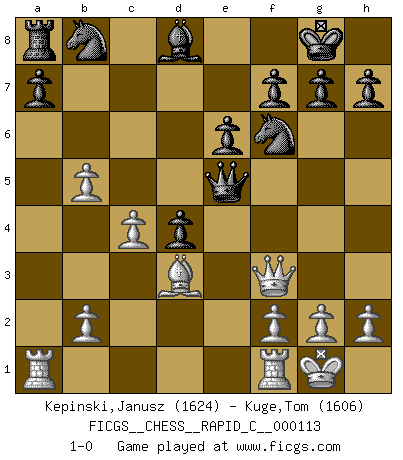 Last move : 1-0 2013 August 5 18:22:0 [Event "FICGS__CHESS__RAPID_C__000113"] [Site "FICGS"] [Date "2013.07.29"] [Round "1"] [White "Kepinski,Janusz"] [Black "Kuge,Tom"] [Result "1-0"] [WhiteElo "1624"] [BlackElo "1606"] 1.d4 Nf6 2.c4 e6 3.Nf3 b6 4.e3 Bb4+ 5.Bd2 Be7 6.Bd3 Ba6 7.O-O O-O 8.a4 c5 9.dxc5 bxc5 10.Bc3 d5 11.Ne5 Qc7 12.Na3 Rd8 13.Nb5 Bxb5 14.axb5 d4 15.exd4 cxd4 16.Ba5 Qxe5 17.Bxd8 Bxd8 18.Qf3 1-0 Queen's Indian : 4.e3 Kingside Castling by player White (move 7) Kingside Castling by player Black (move 7) Player White won this chess game. Follow this game move after move (download)The game of Chess is not merely an idle amusement; several very valuable qualities of the mind are to be acquired and strengthened by it, so as to become habits ready on all occasions; for life is a kind of Chess. (Benjamin Franklin) Besser ein falscher Plan, logisch durchgeführt, als gar kein Plan. (Viktor Kortschnoi) La belleza de un movimiento no se refleja solo en su apariencia, sino en el pensamiento detrás de él. (Siegbert Tarrasch) Je ne crois pas en la psychologie, je crois aux bons coups. (Robert Fischer) Man is reluctant to give credit for intelligence to anyone, except his enemies. (Albert Einstein)