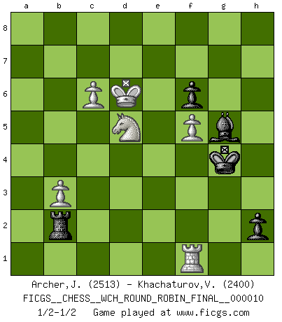 Last move : 1/2-1/2 2014 March 5 15:37:48 [Event "FICGS__CHESS__WCH_ROUND_ROBIN_FINAL__000010"] [Site "FICGS"] [Date "2013.07.29"] [Round "1"] [White "Archer,J. Robert"] [Black "Khachaturov,Vadim"] [Result "1/2-1/2"] [WhiteElo "2513"] [BlackElo "2400"] 1.e4 e5 2.Nf3 Nf6 3.Nxe5 d6 4.Nf3 Nxe4 5.Nc3 Nxc3 6.dxc3 Be7 7.Be3 Nc6 8.Qd2 O-O 9.O-O-O Ne5 10.Kb1 Be6 11.h4 c6 12.Nd4 Bd7 13.h5 Re8 14.Bf4 Bf8 15.f3 a6 16.g4 b5 17.Qf2 a5 18.Bxe5 dxe5 19.Nf5 Qc7 20.Bd3 b4 21.Qe1 bxc3 22.Qxc3 Rab8 23.Bc4 h6 24.Qd3 Be6 25.Bxe6 Rxe6 26.Rhe1 a4 27.Re4 a3 28.b3 R6e8 29.Qe2 Red8 30.Rc1 Rd5 31.Ne3 R5d8 32.Nc4 f6 33.c3 Bc5 34.Rf1 Rd5 35.f4 exf4 36.Rexf4 Rbd8 37.Kc2 Bd6 38.Re4 Be5 39.Re3 Qd7 40.Kb1 c5 41.Rc1 Qf7 42.Qf3 g5 43.hxg6 Qxg6+ 44.Qf5 Qxf5+ 45.gxf5 Bf4 46.Rg1+ Bg5 47.Rf3 h5 48.Nxa3 Rd1+ 49.Rxd1 Rxd1+ 50.Kb2 h4 51.Nc4 Rg1 52.Ne3 Re1 53.Nd5 Re2+ 54.Ka3 Kg7 55.Ka4 Rxa2+ 56.Kb5 Rb2 57.c4 Kh6 58.Kxc5 Kh5 59.Kd6 Kg4 60.Rf1 h3 61.c5 h2 62.c6 1/2-1/2 Petrov : Nimzovich attack Kingside Castling by player Black (move 8) Queenside Castling by player White (move 9) This chess game ended in a draw. Follow this game move after move (download)When in doubt... play Chess ! (Tevis) Jeder weiß, dass Gasprom Putins persönliches Machtinstrument ist. Die Firma wird vom Kreml aus geleitet und wird schon deshalb nie transparent sein. (Garry Kasparov) El Ajedrez, como cualquier otra actividad creativa, puede existir solo a través de méritos combinados de aquellos que tienen talento creativo y de aquellos que tienen la habilidad de organizar un trabajo creativo. (Mikhail Botvinnik) On croit qu'il y a plus de mauvais joueurs que de bons joueurs, c'est faux : Il y a autant de joueurs qui gagnent que de joueurs qui perdent. (Philippe Geluck) Pretend inferiority and encourage his arrogance. (Sun Tzu)