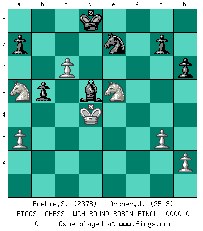 Last move : 0-1 2014 January 15 23:11:32 [Event "FICGS__CHESS__WCH_ROUND_ROBIN_FINAL__000010"] [Site "FICGS"] [Date "2013.07.29"] [Round "1"] [White "Boehme,Sebastian"] [Black "Archer,J. Robert"] [Result "0-1"] [WhiteElo "2378"] [BlackElo "2513"] 1.d4 Nf6 2.c4 e6 3.Nf3 d5 4.g3 Be7 5.Bg2 O-O 6.O-O dxc4 7.Ne5 c5 8.dxc5 Qc7 9.Nxc4 Qxc5 10.b3 Rd8 11.Nbd2 Qc7 12.Bb2 Nc6 13.Rc1 Bd7 14.a3 Be8 15.b4 Rac8 16.e3 b5 17.Na5 Qb6 18.Nab3 Nd7 19.Qe2 Bf6 20.Bxf6 Nxf6 21.Rc5 Ne7 22.Rfc1 Rxc5 23.Rxc5 Qd6 24.Qd1 Rc8 25.Rxc8 Nxc8 26.Qc2 Nb6 27.Nd4 h6 28.Qc5 Qxc5 29.bxc5 Nbd5 30.Bxd5 Nxd5 31.e4 Ne7 32.f4 Bd7 33.N2b3 f6 34.Na5 e5 35.fxe5 fxe5 36.Nf3 Bc6 37.Kf2 Bxe4 38.Nxe5 Bd5 39.Ke3 Kf8 40.Kd4 Ke8 41.c6 Kd8 0-1 This chess game has been lost on time (started : 2013.07.29 22:26:55) Queen's pawn game Kingside Castling by player Black (move 5) Kingside Castling by player White (move 6) Player Black won this chess game. Follow this game move after move (download)Chess teaches you to control the initial excitement you feel when you see something that looks good and it trains you to think objectively when you're in trouble. (Stanley Kubrick) Ein typischer, sehr verbreiteter Gedankenschädling ist der, daß der betreffende Amateur von der Annanhme ausgeht, daß jeder einzelne Zug etwas zu leisten habe. (Aaron Nimzowitsch) Cuando tu casa esta en llamas, no puedes ser molestado por tus vecinos. O, como decinos en Ajedrez, si tu Rey esta bajo ataque, no te preocupa perder un Peón del lado de la Reina. (Gary Kasparov) Nous sommes les pions de la mystérieuse partie d'Echecs jouée par Dieu. Il nous déplace, nous arrête, nous pousse encore, puis nous lance un à un dans la boîte du Néant. Epitaphe sur la tombe de David Janowsky (1868-1927). Man is still the most extraordinary computer of all. (John F. Kennedy)