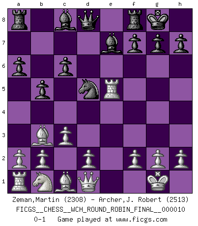 Last move : 0-1 2013 September 17 14:20:51 [Event "FICGS__CHESS__WCH_ROUND_ROBIN_FINAL__000010"] [Site "FICGS"] [Date "2013.07.29"] [Round "1"] [White "Zeman,Martin"] [Black "Archer,J. Robert"] [Result "0-1"] [WhiteElo "2308"] [BlackElo "2513"] 1.e4 e5 2.Nf3 Nc6 3.Bb5 a6 4.Ba4 Nf6 5.O-O Be7 6.Re1 b5 7.Bb3 O-O 8.c3 d5 9.exd5 Nxd5 10.Nxe5 Nxe5 11.Rxe5 c6 0-1 This chess game has been lost on time (started : 2013.07.29 22:26:55) Ruy Lopez : Closed, 7...O-O Kingside Castling by player White (move 5) Kingside Castling by player Black (move 7) Player Black won this chess game. Follow this game move after move (download)The stomach is an essential part of the Chess master. (Bent Larsen) Drei Punkte vor allen anderen ist wie einer, der im weißen Anzug posiert, während der Rest in Müllsäcke gekleidet dasteht. (Viktor Kortschnoi) ¿Se han dado cuenta de que Fischer casi nunca ha tenido piezas malas? El las intercambia y las piezas malas se quedan con sus oponenets. (Yuri Balashov) Il n'y a pas eu de défaite parce que je ne crois pas que cet ordinateur ait jamais existé. IBM a triché en refusant d'imprimer les modes de recherche de la machine. C'est évident, pendant le match, des coups décisifs ont été joués par des êtres humains. Aujourd'hui, les meilleurs spécialistes en informatique ne peuvent toujours pas expliquer comment Deep-Blue a pu jouer contre la logique des ordinateurs. IBM a gagné une guerre de communication, mais ils sont incapables de prouver que l'ordinateur a gagné tout seul. (Garry Kasparov) Bobby never cared about money, though. His only desire was to prove that his choices were correct: He wanted chess to be important because he was a chess player, and he wanted to be important. Bobby knew money was important, but he didn't have a clue why, outside of clothes and status. The only way he could accomplish what he wanted was to fight for a lot of money. Once he got it, he gave it away. He did not know how to spend it. And once he'd become champion, after, essentially, sacrificing his life for it, he didn't know how to spend his time. (Bob Wade)