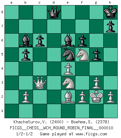 Last move : 1/2-1/2 2013 November 18 13:25:17 [Event "FICGS__CHESS__WCH_ROUND_ROBIN_FINAL__000010"] [Site "FICGS"] [Date "2013.07.29"] [Round "1"] [White "Khachaturov,Vadim"] [Black "Boehme,Sebastian"] [Result "1/2-1/2"] [WhiteElo "2400"] [BlackElo "2378"] 1.d4 Nf6 2.c4 c6 3.Nf3 d5 4.Nc3 e6 5.e3 Nbd7 6.Qc2 Bd6 7.Bd3 dxc4 8.Bxc4 O-O 9.O-O b5 10.Be2 Bb7 11.Rd1 Qc7 12.e4 e5 13.Bg5 exd4 14.Rxd4 Ne5 15.g3 Bc5 16.Rd2 Nfg4 17.Nd1 Bb6 18.Nd4 f6 19.Bf4 Rfd8 20.Nf5 g5 21.Bxe5 Nxe5 22.Rxd8+ Rxd8 23.a4 Kh8 24.Nde3 a6 25.Rd1 Rxd1+ 26.Qxd1 Bc8 27.Kg2 Be6 28.axb5 axb5 29.Qd2 Qd8 30.Qc3 1/2-1/2 Queen's pawn game Kingside Castling by player Black (move 8) Kingside Castling by player White (move 9) This chess game ended in a draw. Follow this game move after move (download)One doesn't have to play well, it's enough to play better than your opponent. (Siegbert Tarrasch) Bis zum Jahr 1971 verlief in meiner Schachkariere alles glatt. Dieses dramatische Match [Fischer-Taimanov 6:0] machte mein Leben zur Hölle. (Mark Taimanov) Solo los afeminados hacen el Enroque. (Rob Sillars) Le thème de l'attaque double intervient d'une manière ou d'une autre dans l'immense majorité des combinaisons. (Youri Averbakh) The hypothalamus is one of the most important parts of the brain, involved in many kinds of motivation, among other functions. The hypothalamus controls the 'Four Fs: Fighting, Fleeing, Feeding and Mating. (Unknown author)