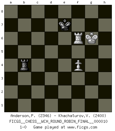 Last move : 1-0 2013 November 9 19:13:58 [Event "FICGS__CHESS__WCH_ROUND_ROBIN_FINAL__000010"] [Site "FICGS"] [Date "2013.07.29"] [Round "1"] [White "Anderson,Peter W."] [Black "Khachaturov,Vadim"] [Result "1-0"] [WhiteElo "2346"] [BlackElo "2400"] 1.d4 Nf6 2.c4 e6 3.Nf3 b6 4.g3 Ba6 5.Qc2 c5 6.d5 exd5 7.cxd5 Bb7 8.Bg2 Nxd5 9.O-O Be7 10.Rd1 Qc8 11.a3 Nc7 12.Nc3 O-O 13.Bf4 Ne6 14.Bd6 Bxd6 15.Rxd6 Bxf3 16.Bxf3 Nd4 17.Qd3 Nxf3+ 18.Qxf3 Nc6 19.Rad1 Re8 20.Qd5 Re7 21.e3 h6 22.h3 Qe8 23.Qg2 Rc8 24.Nd5 Re6 25.Rxd7 Rd8 26.Nxb6 axb6 27.Qxc6 Rxd7 28.Qxd7 Rxe3 29.Qxe8+ Rxe8 30.Rd6 Rb8 31.Rc6 Kf8 32.b4 cxb4 33.axb4 b5 34.g4 Ke7 35.Kg2 Kd7 36.Rc5 Rb6 37.h4 Ke6 38.f4 g6 39.Kf3 Kd7 40.Rd5+ Kc7 41.h5 Rc6 42.hxg6 fxg6 43.Rxb5 Rc3+ 44.Ke4 Rg3 45.g5 hxg5 46.Rxg5 Rb3 47.Rxg6 Rxb4+ 48.Kf5 Kd7 49.Rf6 Ke7 50.Kg6 1-0 Queen's Indian : Nimzovich variation (exaggerated Fianchetto) Kingside Castling by player White (move 9) Kingside Castling by player Black (move 12) 10 pieces endgame at move 42 : White KRPPP , Black KRPPP WHITE : King + 1 Rook 3 Pawns BLACK : King + 1 Rook 3 Pawns 9 pieces endgame at move 43 : White KRPPP , Black KRPP WHITE : King + 1 Rook 3 Pawns BLACK : King + 1 Rook 2 Pawns 8 pieces endgame at move 45 : White KRPP , Black KRPP WHITE : King + 1 Rook 2 Pawns BLACK : King + 1 Rook 2 Pawns 7 pieces endgame at move 46 : White KRPP , Black KRP WHITE : King + 1 Rook 2 Pawns BLACK : King + 1 Rook 1 Pawn 6 pieces endgame at move 47 : White KRPP , Black KR WHITE : King + 1 Rook 2 Pawns BLACK : King + 1 Rook 5 pieces endgame at move 47 : White KRP , Black KR WHITE : King + 1 Rook 1 Pawn BLACK : King + 1 Rook Player White won this chess game. Follow this game move after move (download)You cannot play at Chess if you are kind-hearted. (French Proverb) Ich glaube nicht an Psychologie, ich glaube an gute Züge. (Robert James Fischer) Bobby es la celebridad menos entendida y malinterpretada que camina el la faz de esta tierra. (Yasser Seirawan) Des idées, des idées, j'en ai cent, j'en ai mille. Des bonnes, des mauvaises, applicables, irréalisables... Il suffit de faire le tri ! (Roos) Happy endings are just stories that haven't finished yet. (Jane Smith in Mr & Mrs Smith)