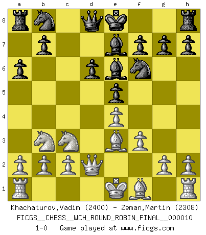 Last move : 1-0 2013 September 20 2:32:6 [Event "FICGS__CHESS__WCH_ROUND_ROBIN_FINAL__000010"] [Site "FICGS"] [Date "2013.07.29"] [Round "1"] [White "Khachaturov,Vadim"] [Black "Zeman,Martin"] [Result "1-0"] [WhiteElo "2400"] [BlackElo "2308"] 1.e4 c5 2.Nf3 d6 3.d4 cxd4 4.Nxd4 Nf6 5.Nc3 a6 6.Be3 e5 7.Nb3 Be6 8.f3 Be7 9.Qd2 1-0 This chess game has been lost on time (started : 2013.07.29 22:26:55) Sicilian : Najdorf, Byrne (English) attack Player White won this chess game. Follow this game move after move (download)Place the contents of the Chess box in a hat, shake them up vigorously, pour them on the board from a height of two feet, and you get the style of Steinitz. (H. E. Bird) Wenn du nicht weißt was du tun sollst, warte bis dein Gegner eine Idee hat. Sie wird sicher schlecht sein. (Siegbert Tarrasch) La mitad de las variaciones que son calculadas en una partida de torneo, resultan ser completamente superfluas. Desafortunadamente, nadie sabe por adelantado cual mitad. (Jan Tinman) Les échecs, c'est la lutte contre l'erreur. (Johannes Zukertort) A shortcut is the longest distance between two points. (Don Groves)
