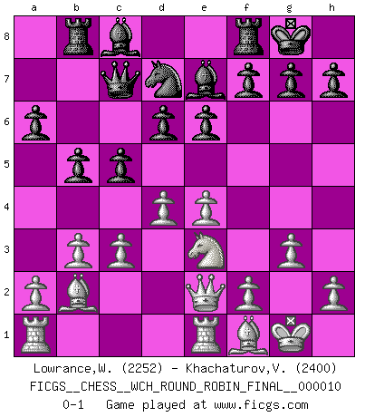 Last move : 0-1 2013 October 8 15:28:31 [Event "FICGS__CHESS__WCH_ROUND_ROBIN_FINAL__000010"] [Site "FICGS"] [Date "2013.08.07"] [Round "1"] [White "Lowrance,Wayne"] [Black "Khachaturov,Vadim"] [Result "0-1"] [WhiteElo "2252"] [BlackElo "2400"] 1.e4 c5 2.Nf3 Nc6 3.Nc3 Nf6 4.Bb5 Qc7 5.O-O Nd4 6.Re1 a6 7.Bf1 Ng4 8.g3 Nxf3+ 9.Qxf3 Ne5 10.Qe2 e6 11.b3 d6 12.Nd1 Be7 13.Bb2 O-O 14.c3 Nd7 15.Ne3 b5 16.d4 Rb8 0-1 This chess game has been lost on time (started : 2013.08.07 23:45:52) Sicilian defense Kingside Castling by player White (move 5) Kingside Castling by player Black (move 13) Player Black won this chess game. Follow this game move after move (download)Nowadays, when you're not a grandmaster at 14, you can forget about it. (Anand Viswanathan) Ich war zu klein für die Schach-Schülermannschaft! (Woody Allen) Bendita sea la memoria de aquel que dio al mundo este juego inmortal. (A. G. Gardiner) Les Cavaliers se révèlent fort utiles dans les positions fermées. D'habitude, les Fous sont un peu plus forts que les Cavaliers dans les positions ouvertes. Qu'on le veuille ou non, il restera toujours des exceptions ! The Internet is the world's largest library. It's just that all the books are on the floor. (John Allen Paulos)