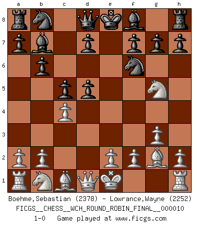 Last move : 1-0 2013 October 19 4:37:48 [Event "FICGS__CHESS__WCH_ROUND_ROBIN_FINAL__000010"] [Site "FICGS"] [Date "2013.08.07"] [Round "1"] [White "Boehme,Sebastian"] [Black "Lowrance,Wayne"] [Result "1-0"] [WhiteElo "2378"] [BlackElo "2252"] 1.d4 Nf6 2.c4 e6 3.Nf3 b6 4.g3 Bb7 5.Bg2 c5 6.d5 exd5 7.Ng5 1-0 This chess game has been lost on time (started : 2013.08.07 23:45:52) Queen's Indian : Buerger variation Player White won this chess game. Follow this game move after move (download)For me, Chess is life and every game is like a new life. Every Chess player gets to live many lives in one lifetime. (Eduard Gufeld) Wir können eben der zündenden Macht des Opfers nicht wiederstehen, denn die Begeisterung für das Opfer liegt in der Natur des Menschen. (Rudolf Spielmann) No solamente yo pronostico su triunfo sobre Botvinnik, sino que me adelanto y digo que probablemente Fischer es el jugador de Ajedrez mas grande que haya existido. (John Collins) Le plus grand jeu de l'esprit jamais inventé, plus vous l'apprenez, plus vous y prenez du plaisir. (Garry Kasparov) Games, world of games... There's always an opponent, and there's always a victim. (Revolver, movie)