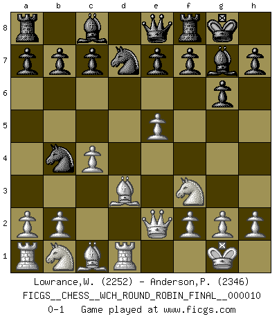 Last move : 0-1 2013 October 9 15:36:17 [Event "FICGS__CHESS__WCH_ROUND_ROBIN_FINAL__000010"] [Site "FICGS"] [Date "2013.08.07"] [Round "1"] [White "Lowrance,Wayne"] [Black "Anderson,Peter W."] [Result "0-1"] [WhiteElo "2252"] [BlackElo "2346"] 1.e4 g6 2.d4 Bg7 3.Nf3 d6 4.Bd3 Nf6 5.O-O Nbd7 6.e5 dxe5 7.dxe5 Nd5 8.Qe2 O-O 9.c4 Nb4 10.Rd1 Qe8 0-1 This chess game has been lost on time (started : 2013.08.07 23:45:52) Robatsch (Modern) defense Kingside Castling by player White (move 5) Kingside Castling by player Black (move 8) Player Black won this chess game. Follow this game move after move (download)Many have become Chess Masters, no one has become the Master of Chess. (Siegbert Tarrasch) Der vorletzte Fehler gewinnt. (Savielly Grigorievitsch Tartakower) Yo creo que el Ajedrez posee una magia que es también una ayuda en la edad avanzada. Una rodilla reumática es olvidada durante una partida de Ajedrez y otros eventos pueden parecer algo sin importancia comparada a una catástrofe en el tablero de Ajedrez. (Vlastimil Hort) D'abord les bases : Jouez et étudiez, puis étudiez et jouez, ensuite jouez et étudiez, puis étudiez et jouez. Deuxièmement : Donnez toujours le meilleur de vous-même ! (Ken Smith) I have opinions of my own - strong opinions - but I don't always agree with them. (George Bush)