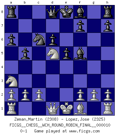 Last move : 0-1 2013 September 12 13:48:57 [Event "FICGS__CHESS__WCH_ROUND_ROBIN_FINAL__000010"] [Site "FICGS"] [Date "2013.07.29"] [Round "1"] [White "Zeman,Martin"] [Black "Lopez,Jose"] [Result "0-1"] [WhiteElo "2308"] [BlackElo "2325"] 1.e4 c5 2.Nf3 Nc6 3.d4 cxd4 4.Nxd4 Nf6 5.Nc3 e5 6.Ndb5 d6 7.Bg5 a6 8.Na3 b5 9.Bxf6 gxf6 10.Nd5 f5 11.exf5 Bxf5 0-1 This chess game has been lost on time (started : 2013.07.29 22:26:55) Sicilian : Pelikan (Lasker/Sveshnikov) variation Player Black won this chess game. Follow this game move after move (download)A good player is always lucky. (Jose Raul Capablanca) Ein Schachgenie ist jemand der verdammt gut Schach spielt. (Jonathan Levitt) En el Ajedrez, tal como es jugado por los Maestros, practicamente la suerte es eliminada. (Emanuel Lasker) Les échecs sont un jeu par leur forme, un art par leur essence et une science par sa difficulté d'acquisition. Ils peuvent vous procurer autant de plaisir qu'un bon livre ou une belle musique, mais vous n'aurez une réelle joie que si vous arrivez à bien jouer. (Tigran Petrosian) Wisdom is the reward you get for a lifetime of listening when you'd have preferred to talk. (Doug Larson)