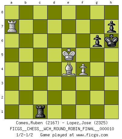 Last move : 1/2-1/2 2014 March 9 16:58:18 [Event "FICGS__CHESS__WCH_ROUND_ROBIN_FINAL__000010"] [Site "FICGS"] [Date "2013.07.29"] [Round "1"] [White "Comes,Ruben"] [Black "Lopez,Jose"] [Result "1/2-1/2"] [WhiteElo "2167"] [BlackElo "2325"] 1.e4 c5 2.Nf3 Nc6 3.d4 cxd4 4.Nxd4 Nf6 5.Nc3 e5 6.Ndb5 d6 7.Bg5 a6 8.Na3 b5 9.Nd5 Be7 10.Bxf6 Bxf6 11.c3 O-O 12.Nc2 Bg5 13.a4 bxa4 14.Rxa4 a5 15.Bc4 Rb8 16.b3 Kh8 17.Nce3 Ne7 18.O-O Nxd5 19.Nxd5 f5 20.exf5 Bxf5 21.Qe2 Be6 22.Rd1 Rc8 23.g3 Bd7 24.Ra2 Be6 25.Qe4 Bf5 26.Qe1 Bg4 27.Be2 Be6 28.c4 Rb8 29.h4 Bxh4 30.gxh4 Qxh4 31.Ne3 Rxb3 32.Bf1 Qg5+ 33.Bg2 a4 34.Qd2 Qf4 35.Qxd6 Rxe3 36.Qxe6 Rc3 37.Re2 Rc1 38.Rxc1 Qxc1+ 39.Kh2 Qf4+ 40.Kh3 Rf6 41.Qe8+ Rf8 42.Qxe5 Qxc4 43.Bd5 Qd3+ 44.Kg2 Qg6+ 45.Qg3 Qxg3+ 46.Kxg3 g6 47.Re5 Rc8 48.Be4 Rc7 49.Ra5 Kg7 50.Rxa4 Rd7 51.Rb4 Rd2 52.Rb7+ Kh6 53.f4 Rd4 54.Kf3 Rd8 55.Ke3 Re8 56.Rd7 Rc8 57.Bd5 Rf8 58.Ke4 Re8+ 59.Kd4 Rb8 60.Ke5 Rb5 61.Ra7 Rc5 62.Ra6 Kg7 63.Ke4 Rc7 64.Kd4 Re7 65.Rb6 Re1 66.Rb7+ Kh6 67.Be4 Rd1+ 68.Ke5 Rc1 69.Ra7 1/2-1/2 Sicilian : Pelikan (Lasker/Sveshnikov) variation Kingside Castling by player Black (move 11) Kingside Castling by player White (move 18) 10 pieces endgame at move 45 : White KRBP , Black KQRPPP WHITE : King + 1 Rook 1 Bishop 1 Pawn BLACK : King + 1 Queen 1 Rook 3 Pawns 9 pieces endgame at move 46 : White KRBP , Black KRPPP WHITE : King + 1 Rook 1 Bishop 1 Pawn BLACK : King + 1 Rook 3 Pawns 8 pieces endgame at move 50 : White KRBP , Black KRPP WHITE : King + 1 Rook 1 Bishop 1 Pawn BLACK : King + 1 Rook 2 Pawns This chess game ended in a draw. Follow this game move after move (download)Could we look into the head of a Chess player, we should see there a whole world of feelings, images, ideas, emotion and passion. (Alfred Binet) Es hat in meinem Leben Zeiten gegeben, in denen das Schachspiel, wenn nicht zum Lebenszweck, so doch zu einem regelrechten Lebensersatz geworden ist. Man fühlt sich in solchen Zeiten nicht so, als besäße man eine göttliche Gabe, sondern eher so, als sei man von ihr besessen. (Garry Kasparov) ¡Examina movidas que hagan daño! Un buen ojo for movidas desvastantes es mucho mas importante que el conocimiento de principios estratégicos. (Purdy) Un millionnaire : 'Monsieur Steinitz ! Vous ne participez aux tournois que pour l'argent, alors que moi je n'y viens que pour l'honneur.' Steinitz : 'Chacun joue pour ce qu'il n'a pas'... If you work for a living, why do you kill yourself working ? (Tuco to a chicken in The Good, The Bad and The Ugly)