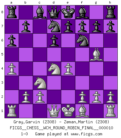 Last move : 1-0 2013 September 8 13:27:37 [Event "FICGS__CHESS__WCH_ROUND_ROBIN_FINAL__000010"] [Site "FICGS"] [Date "2013.07.29"] [Round "1"] [White "Gray,Garvin"] [Black "Zeman,Martin"] [Result "1-0"] [WhiteElo "2308"] [BlackElo "2308"] 1.e4 c5 2.Nf3 d6 3.d4 cxd4 4.Nxd4 Nf6 5.Nc3 a6 6.Bg5 Nbd7 7.a4 1-0 This chess game has been lost on time (started : 2013.07.29 22:26:55) Sicilian : Najdorf, 6.Bg5 Player White won this chess game. Follow this game move after move (download)I'd rather have a Pawn than a finger. (Reuben Fine) Ich verlor meine Bürgerrechte, mein Gehalt wurde mir nicht mehr bezahlt und ich wurde zensiert und durfte nicht mehr ins Ausland reisen. [nach dem Match Fischer-Taimanov 6:0] (Mark Taimanov) Evita las multitudes. Haz independientemente tu propio razonamiento. Trata de ser el jugador de Ajedrez, no la pieza de Ajedrez. (Ralph Charell) Je menace de comprendre la position. (Anonyme) Thus, what is of supreme importance in war is to attack the enemy's strategy. (Sun Tzu)