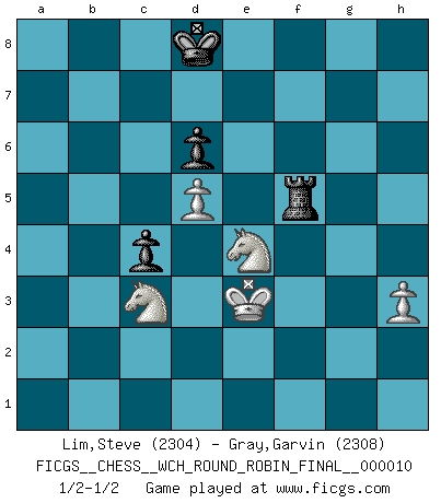Last move : 1/2-1/2 2013 December 2 3:19:59 [Event "FICGS__CHESS__WCH_ROUND_ROBIN_FINAL__000010"] [Site "FICGS"] [Date "2013.07.29"] [Round "1"] [White "Lim,Steve"] [Black "Gray,Garvin"] [Result "1/2-1/2"] [WhiteElo "2304"] [BlackElo "2308"] 1.d4 Nf6 2.c4 e6 3.Nf3 c5 4.d5 exd5 5.cxd5 d6 6.Nc3 g6 7.Bf4 a6 8.a4 Bg7 9.h3 O-O 10.e3 Nbd7 11.Be2 Ne8 12.a5 b6 13.axb6 Nxb6 14.O-O Nc7 15.e4 Re8 16.Bg5 Qd7 17.Qb3 Rb8 18.Nd2 h6 19.Bh4 f5 20.Bg3 Qe7 21.e5 Bxe5 22.Bxe5 Qxe5 23.Nc4 Qf6 24.Nxb6 Qd8 25.Ra3 Kg7 26.Rfa1 Re7 27.Bxa6 Nxa6 28.Rxa6 Bxa6 29.Rxa6 Re1+ 30.Kh2 Qh4 31.g3 Qd4 32.Qc2 f4 33.Kg2 fxg3 34.Ra7+ Kh8 35.Rf7 gxf2 36.Qxf2 Qxf2+ 37.Kxf2 Rc1 38.Nba4 g5 39.Rf6 Rd8 40.Ne4 Rc4 41.Nac3 Rb8 42.Rxh6+ Kg7 43.Rh5 Rxb2+ 44.Kf1 Kf8 45.Rxg5 Rd4 46.Rg3 Ke7 47.Re3 c4 48.Nf2 Kd8 49.Re2 Rxe2 50.Kxe2 Rf4 51.Ke3 Rf5 52.Nfe4 1/2-1/2 Comment by player 1 : Steve Lim : Should be drawn I think. Although white missed some better moves earlier =) Queen's pawn game Kingside Castling by player Black (move 9) Kingside Castling by player White (move 14) 10 pieces endgame at move 49 : White KNNPP , Black KRRPP WHITE : King + 2 Knights 2 Pawns BLACK : King + 2 Rooks 2 Pawns 9 pieces endgame at move 50 : White KNNPP , Black KRPP WHITE : King + 2 Knights 2 Pawns BLACK : King + 1 Rook 2 Pawns This chess game ended in a draw. Follow this game move after move (download)Chess is the art which expresses the science of logic. (Mikhail Botvinnik) Wer sich die Fähigkeit anerziehen will im Schach selbstständig zu denken, der muß alles meiden, was leblos ist: ausgeklügelte Theorien, die sich auf sehr wenige Beispiele und eine Menge Hirngespinste stützen. (Emanuel Lasker) Los tropiezos estan todos ahí en el tablero, esperando que se cometan. (Savielly Tartakover) J'ai vu le vaincu d'Echecs jouer des années durant dans l'espoir de la fête de la victoire. Car tu es plus riche de ce qu'elle existe si même elle n'est point pour toi. Ainsi de la perle du fond des mers. (Antoine de Saint-Exupéry) The absolute truth is the thing that makes people laugh. (Carl Reiner)