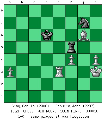 Last move : 1-0 2014 March 2 8:54:33 [Event "FICGS__CHESS__WCH_ROUND_ROBIN_FINAL__000010"] [Site "FICGS"] [Date "2013.07.29"] [Round "1"] [White "Gray,Garvin"] [Black "Schutte,John"] [Result "1-0"] [WhiteElo "2308"] [BlackElo "2297"] 1.e4 c5 2.Nf3 d6 3.d4 cxd4 4.Nxd4 Nf6 5.Nc3 a6 6.Be3 e5 7.Nb3 Be6 8.f3 h5 9.Nd5 Bxd5 10.exd5 Nbd7 11.Qd2 g6 12.Be2 Bg7 13.O-O b6 14.Rac1 O-O 15.h3 Qc7 16.Rfe1 Rfe8 17.c3 Kh7 18.Bf1 Qb7 19.Rcd1 Kg8 20.c4 Qc7 21.Na1 e4 22.f4 Nc5 23.Bd4 a5 24.Nc2 Qd8 25.f5 Kh7 26.Be2 Bh6 27.Be3 Bxe3+ 28.Qxe3 Ng8 29.Rf1 Qf6 30.fxg6+ Qxg6 31.Rf4 Nh6 32.Rdf1 Nd7 33.Nd4 Re5 34.Kh2 Rae8 35.R1f2 Rg8 36.g3 Qg5 37.Qc3 a4 38.Rg2 Nf6 39.Qb4 b5 40.Qxd6 Ne8 41.Qa3 bxc4 42.Nc6 Rf5 43.Rxe4 Nf6 44.Rxc4 Nxd5 45.Qd3 Kh8 46.Re4 Qg7 47.Qd4 a3 48.Qxg7+ Kxg7 49.b4 Rc8 50.Ne7 Nxe7 51.Rxe7 Rc3 52.Ra7 Re5 53.Ra5 Re4 54.Rg5+ Kh7 55.b5 Rb4 56.Rxh5 Kg7 57.Rg5+ Kf8 58.Rd5 f6 59.Rd6 Ke7 60.Rc6 Re3 61.b6 Nf5 62.Bg4 Nd4 63.Rc7+ Kd6 64.Rd2 Re4 65.Rc3 Rb2 66.Rcd3 Kc6 67.Rg2 f5 68.Bh5 Rxb6 69.Rxa3 Re1 70.Rd2 R6b1 71.h4 Rbc1 72.Rad3 Rh1+ 73.Kg2 Rhg1+ 74.Kh3 Rh1+ 75.Rh2 Rxh2+ 76.Kxh2 Kd5 77.Re3 Kd6 78.a3 Rc5 79.Bg6 Ne6 80.Bf7 Ng7 81.Kh3 f4 82.gxf4 Rf5 83.Bg6 1-0 Sicilian : Najdorf, Byrne (English) attack Kingside Castling by player White (move 13) Kingside Castling by player Black (move 14) 10 pieces endgame at move 76 : White KRBPPP , Black KRNP WHITE : King + 1 Rook 1 Bishop 3 Pawns BLACK : King + 1 Rook 1 Knight 1 Pawn 9 pieces endgame at move 82 : White KRBPPP , Black KRN WHITE : King + 1 Rook 1 Bishop 3 Pawns BLACK : King + 1 Rook 1 Knight Player White won this chess game. Follow this game move after move (download)The older I grow, the more I value Pawns. (Keres) Ich würde die 30 stärksten Spieler der USA im Simultanspiel besiegen. (José Raúl Capablanca) Combinaciones deslumbrantes son para la mayoría, mover madera es para los pocos. (Georg Kieninger) A ce moment-là, je menaçais de comprendre la position ! (Clément L'Heureux) A government big enough to give you everything you want is strong enough to take everything you have. (Thomas Jefferson)