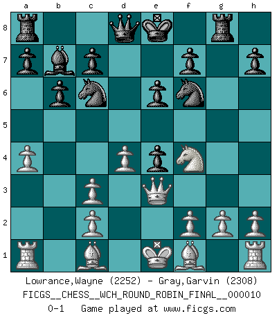 Last move : 0-1 2013 October 13 16:9:25 [Event "FICGS__CHESS__WCH_ROUND_ROBIN_FINAL__000010"] [Site "FICGS"] [Date "2013.08.07"] [Round "1"] [White "Lowrance,Wayne"] [Black "Gray,Garvin"] [Result "0-1"] [WhiteElo "2252"] [BlackElo "2308"] 1.e4 e6 2.d4 d5 3.Nc3 Bb4 4.a3 Bxc3+ 5.bxc3 dxe4 6.Qg4 Nf6 7.Qxg7 Rg8 8.Qh6 Rg6 9.Qe3 b6 10.Nh3 Bb7 11.Nf4 Rg8 12.a4 Nc6 0-1 This chess game has been lost on time (started : 2013.08.07 23:45:52) French : Winawer (Nimzovich) variation Player Black won this chess game. Follow this game move after move (download)When you are lonely, when you feel yourself an alien in the world, play Chess. This will raise your spirits and be your counselor in war. (Aristotle) Wie bekannt hörte Morphy 1859 auf, Schach zu spielen. Seine Enttäuschung galt nicht so sehr dem Schach, wie den Schachspielern. (Robert James Fischer) La única cosa que los jugadores de Ajedrez tienen en común, es el Ajedrez. (Lodewijk Prins) Les Echecs mettent en conflit, non pas deux intelligences, mais deux volontés. (Lasker) To err is human, to shift the blame on someone else is tactical. (Mladen Jankovic)