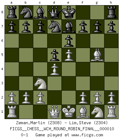Last move : 0-1 2013 September 7 1:25:6 [Event "FICGS__CHESS__WCH_ROUND_ROBIN_FINAL__000010"] [Site "FICGS"] [Date "2013.07.29"] [Round "1"] [White "Zeman,Martin"] [Black "Lim,Steve"] [Result "0-1"] [WhiteElo "2308"] [BlackElo "2304"] 1.e4 e6 2.d4 d5 3.Nc3 Nf6 4.Bg5 Be7 5.e5 Nfd7 0-1 This chess game has been lost on time (started : 2013.07.29 22:26:55) French : Classical Player Black won this chess game. Follow this game move after move (download)In complicated positions, Bobby Fischer hardly had to be afraid of anybody. (Paul Keres) Je mehr ich von der FIDE weiss, um so weniger verstehe ich. (Alexander Kalifman) El Ajedrez es un mar en el cual un mosquito puede beber y un elefante puede bañarse. (Refrán Hindú) Il n'y a pas eu de défaite parce que je ne crois pas que cet ordinateur ait jamais existé. IBM a triché en refusant d'imprimer les modes de recherche de la machine. C'est évident, pendant le match, des coups décisifs ont été joués par des êtres humains. Aujourd'hui, les meilleurs spécialistes en informatique ne peuvent toujours pas expliquer comment Deep-Blue a pu jouer contre la logique des ordinateurs. IBM a gagné une guerre de communication, mais ils sont incapables de prouver que l'ordinateur a gagné tout seul. (Garry Kasparov) Thibault, I ask for draw. Game 13876. - Sorry Ilmars, you won. (FICGS chat)