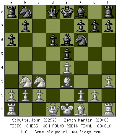 Last move : 1-0 2013 September 10 13:35:42 [Event "FICGS__CHESS__WCH_ROUND_ROBIN_FINAL__000010"] [Site "FICGS"] [Date "2013.07.29"] [Round "1"] [White "Schutte,John"] [Black "Zeman,Martin"] [Result "1-0"] [WhiteElo "2297"] [BlackElo "2308"] 1.e4 c5 2.Nf3 d6 3.d4 cxd4 4.Nxd4 Nf6 5.Nc3 a6 6.Be3 e5 7.Nb3 Be6 8.h3 1-0 This chess game has been lost on time (started : 2013.07.29 22:26:55) Sicilian : Najdorf, Byrne (English) attack Player White won this chess game. Follow this game move after move (download)I prefer to lose a really good game than to win a bad one. (David Levy) Schach ist ein schwarz-weisser Dschungel. (Garry Kasparov) Desconfianza es la característica mas necesaria de un jugador de Ajedrez. (Siegbert Tarrasch) Mon pion favori sur ma case favorite ! Bronstein en parlant d'un coup de pion en h5 quand il avait les Noirs. We're missing something. (Gregory House, House M.D.)