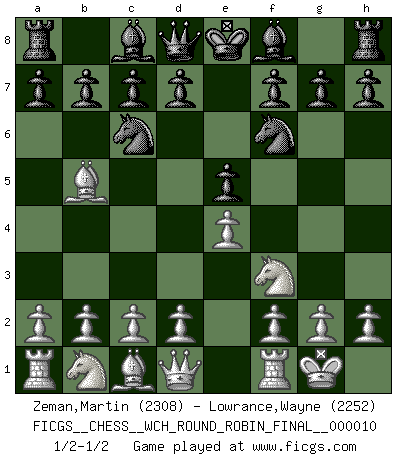 Last move : 1/2-1/2 2013 August 28 1:33:26 [Event "FICGS__CHESS__WCH_ROUND_ROBIN_FINAL__000010"] [Site "FICGS"] [Date "2013.08.07"] [Round "1"] [White "Zeman,Martin"] [Black "Lowrance,Wayne"] [Result "1/2-1/2"] [WhiteElo "2308"] [BlackElo "2252"] 1.e4 e5 2.Nf3 Nc6 3.Bb5 Nf6 4.O-O 1/2-1/2 Ruy Lopez : Berlin defense, 4.O-O Kingside Castling by player White (move 4) This chess game ended in a draw. Follow this game move after move (download)If your opponent cannot do anything active, then don't rush the position; instead you should let him sit there, suffer, and beg you for a draw. (Jeremy Silman) Er war ein guter Schachspieler, aber ich kann Leute nicht ausstehen, die 'Heil Hitler' rufen (Über Alexander Aljechin). (Miguel Najdorf) Haz el enroque temprano y seguido. (Rob Sillars) L'attaque fait le spectacle, la défense gagne les matchs. (Dicton footballistique) The project of the man are lower than those of the sky. (Chinese proverb)