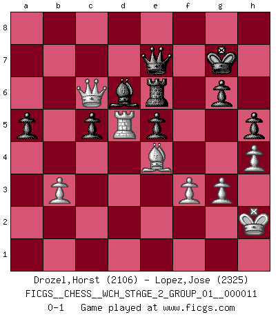 Last move : 0-1 2014 February 8 12:50:0 [Event "FICGS__CHESS__WCH_STAGE_2_GROUP_01__000011"] [Site "FICGS"] [Date "2013.07.30"] [Round "1"] [White "Drozel,Horst"] [Black "Lopez,Jose"] [Result "0-1"] [WhiteElo "2106"] [BlackElo "2325"] 1.e4 c5 2.Nf3 Nc6 3.d4 cxd4 4.Nxd4 Nf6 5.Nc3 e5 6.Ndb5 d6 7.Bg5 a6 8.Na3 b5 9.Nd5 Be7 10.Bxf6 Bxf6 11.c3 O-O 12.Nc2 Bg5 13.a4 bxa4 14.Rxa4 a5 15.Bc4 Rb8 16.b3 Kh8 17.Nce3 Ne7 18.Nxe7 Qxe7 19.Nd5 Qd8 20.O-O f5 21.exf5 Bxf5 22.Qe2 Be6 23.Rd1 Rc8 24.g3 Bd7 25.Bb5 Be6 26.c4 Rb8 27.c5 dxc5 28.Nf4 Qf6 29.Nxe6 Qxe6 30.Bc4 Qb6 31.Ra2 Bf6 32.Rd7 Rbd8 33.Rad2 Qc6 34.Rxd8 Bxd8 35.Qe3 Bc7 36.Qg5 Bd6 37.Rd5 Qc7 38.Qe3 Rf6 39.h4 Qe7 40.Bd3 g6 41.Be4 Qc7 42.Kg2 h5 43.Qh6+ Qh7 44.Qc1 Qc7 45.f3 Kg7 46.Qc4 Be7 47.Qb5 Bd6 48.Qe8 Qe7 49.Qc8 Qf7 50.Kh2 Qe7 51.Qc6 Re6 0-1 This chess game has been lost on time (started : 2013.07.30 0:8:31) Sicilian : Pelikan (Lasker/Sveshnikov) variation Kingside Castling by player Black (move 11) Kingside Castling by player White (move 20) Player Black won this chess game. Follow this game move after move (download)I have always a slight feeling of pity for the man who has no knowledge of Chess. (Siegbert Tarrasch) Besser ein falscher Plan, logisch durchgeführt, als gar kein Plan. (Viktor Kortschnoi) El arma más poderosa en el Ajedrez, es tener la próxima movida. (David Bronstein) Il (Jacob Murray) ne joue pas pour le bon coup, mais pour le meilleur. (Eloi Relange) A specialist learns more and more about less and less until he knows everything about nothing. (Nicholas Murray Butler)
