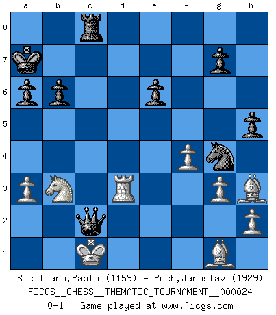 Last move : 0-1 2007 October 19 17:26:22 [Event "FICGS__CHESS__THEMATIC_TOURNAMENT__000024"] [Site "FICGS"] [Date "2007.02.05"] [Round "1"] [White "Siciliano,Pablo"] [Black "Pech,Jaroslav"] [Result "0-1"] [WhiteElo "1159"] [BlackElo "1929"] 1.e4 c5 2.f4 d5 3.Nf3 dxe4 4.Ng5 Nf6 5.Bc4 Bg4 6.Bxf7+ Kd7 7.Qxg4+ Nxg4 8.Be6+ Kc7 9.Bxg4 Qe8 10.Ne6+ Kb6 11.d3 exd3 12.Na3 a6 13.Be3 d2+ 14.Kxd2 Ka7 15.Nxc5 b6 16.Ne6 Qc6 17.Rhg1 Nd7 18.Rad1 Nf6 19.Bh3 h5 20.Rge1 Ng4 21.Bg1 Rh6 22.Nd4 Qd5 23.Kc1 Qxa2 24.Nb3 Rc8 25.Rd3 Rd6 26.Red1 Rxd3 27.Rxd3 e6 28.g3 Bxa3 29.bxa3 Qxc2+ 0-1 Sicilian : Grand Prix attack Player Black won this chess game. Follow this game move after move (download)All that matters on the Chessboard is good moves. (Bobby Fischer) Auf Remis zu spielen ist gewissermaßen ein Verbrechen gegen das Schachspiel. (Mikhail Nekhemyevich Tal) Tu puedes aprender mucho mas de una partida que pierdas que de una partida ganada. Tendras que perder cientos de partidas antes de llegar a ser un buen jugador. (Jose Raul Capablanca) Des combinaisons [dans le jeu d'échecs] pareilles à des mélodies. Je crois entendre pour ainsi dire la musique des coups... (Vladimir Nabokov) Luck never gives; it only lends. (Swedish proverb)