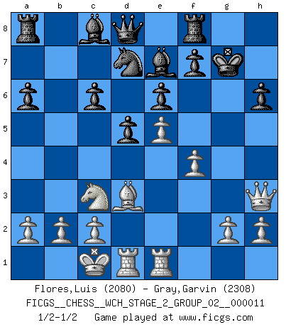 Last move : 1/2-1/2 2013 October 4 23:40:56 [Event "FICGS__CHESS__WCH_STAGE_2_GROUP_02__000011"] [Site "FICGS"] [Date "2013.07.30"] [Round "1"] [White "Flores,Luis"] [Black "Gray,Garvin"] [Result "1/2-1/2"] [WhiteElo "2080"] [BlackElo "2308"] 1.e4 c5 2.Nf3 Nc6 3.d4 cxd4 4.Nxd4 Nf6 5.Nc3 d6 6.Bg5 e6 7.Qd2 a6 8.O-O-O h6 9.Nxc6 bxc6 10.Bf4 d5 11.Qe3 Bb4 12.Be2 O-O 13.e5 Nd7 14.Qg3 Kh8 15.Qh3 Kh7 16.Bd3+ Kg8 17.Rhe1 Be7 18.Bxh6 gxh6 19.f4 Kg7 1/2-1/2 Sicilian defense Queenside Castling by player White (move 8) Kingside Castling by player Black (move 12) This chess game ended in a draw. Follow this game move after move (download)Nothing excites jaded Grandmasters more than a theoretical novelty. (Dominic Lawson) Du musst Deinen Gegner in einen tiefen dunklen Wald führen wo 2+2=5 ist und wo der Weg, der wieder hinausführt, nur breit genug für einen ist. (Mikhail Nekhemyevich Tal) En el Ajedrez, tal como en la vida, las bendiciones de hoy pueden ser el veneno del mañana. (Assaic) Les réformistes prétendent que les progrès de la théorie conduiront à la disparition des échecs, et qu'il faut, pour leur rendre vie, en remanier les règles. En réalité, qu'exprime cette affirmation? Le mépris de l'intuition, de l'imagination et de tous les autres éléments qui font des échecs un art. (Alexander Alekhine) There will be no order, only chaos. (Sol Robeson in Pi by Darren Aronofsky)