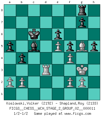 Last move : 1/2-1/2 2013 November 26 18:27:12 [Event "FICGS__CHESS__WCH_STAGE_2_GROUP_02__000011"] [Site "FICGS"] [Date "2013.07.30"] [Round "1"] [White "Koslowski,Volker"] [Black "Shapland,Roy"] [Result "1/2-1/2"] [WhiteElo "2192"] [BlackElo "2133"] 1.e4 c5 2.c3 Nf6 3.e5 Nd5 4.d4 cxd4 5.Nf3 Nc6 6.cxd4 d6 7.Bc4 dxe5 8.dxe5 Ndb4 9.Qb3 e6 10.O-O Na5 11.Bb5+ Bd7 12.Qa4 Bxb5 13.Qxb5+ Nac6 14.Nc3 a6 15.Qc4 Qd3 16.Qg4 h5 17.Qg3 Qc4 18.Rd1 Rd8 19.Rxd8+ Nxd8 20.Bg5 Ndc6 21.Re1 Qg4 22.Rd1 Ne7 23.Rd4 Qxg3 24.hxg3 Nbd5 25.Rd3 f6 26.Bh4 Kf7 27.Nd2 b5 28.Nde4 b4 29.Nxd5 Nxd5 30.Rf3 f5 31.Ng5+ Ke7 32.Nh3 Kd7 33.Rd3 Rg8 34.Bg5 Kc6 35.Nf4 Nxf4 36.gxf4 Bc5 37.Kh2 a5 38.Kg3 1/2-1/2 Sicilian : Alapin's variation (2.c3) Kingside Castling by player White (move 10) This chess game ended in a draw. Follow this game move after move (download)I play correspondence chess because it is both art and science while chess is art only. (A player at FICGS) Die jungen Leute sollen verstehen, dass sie noch etwas von mir lernen können und müssen. (Viktor Kortschnoi) Morphy probablemente fue el genio más grande de todos. (Bobby Fischer) Il vaut toujours mieux jouer un plan faux de façon logique que de n'avoir pas de plan du tout. (Victor Kortchnoï) Establishing goals is all right if you don't let them deprive you of interesting detours. (Doug Larson)
