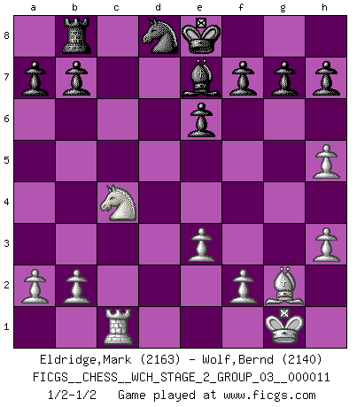 Last move : 1/2-1/2 2013 November 9 22:13:6 [Event "FICGS__CHESS__WCH_STAGE_2_GROUP_03__000011"] [Site "FICGS"] [Date "2013.07.30"] [Round "1"] [White "Eldridge,Mark"] [Black "Wolf,Bernd"] [Result "1/2-1/2"] [WhiteElo "2163"] [BlackElo "2140"] 1.d4 Nf6 2.c4 e6 3.g3 d5 4.Bg2 Be7 5.Nf3 O-O 6.O-O dxc4 7.Ne5 c5 8.dxc5 Qc7 9.Nxc4 Qxc5 10.Qb3 Nc6 11.Be3 Qh5 12.h3 Nd5 13.Rd1 Nxe3 14.Qxe3 Bc5 15.g4 Bxe3 16.gxh5 Bg5 17.e3 Rd8 18.Rxd8+ Nxd8 19.Nc3 Bd7 20.Rd1 Be8 21.Ne4 Be7 22.Ned6 Kf8 23.Nxe8 Kxe8 24.Rc1 Rb8 1/2-1/2 Catalan : Closed, 5.Nf3 Kingside Castling by player Black (move 5) Kingside Castling by player White (move 6) This chess game ended in a draw. Follow this game move after move (download)A win by an unsound combination, however showy, fills me with artistic horror. (Wilhelm Steinitz) Der Umstand, daß uns eine 7 Stunden Zeitkontrolle ermöglicht eine großartige, tiefe Partie zu spielen, ist für die Massenmedien nicht weiter von Bedeutung. (Alexej Shirov) Al jugar al Ajedrez entonces, podemos aprender: Primero: Previsión... Segundo: Prudencia... Tercero: Cautela... Y al final, aprendemos del Ajedrez el hábito de no ser desanimados por apariencias malas presentes en el estado de nuestros asuntos, el hábito de la esperanza por una oportunidad favorable y la perseveración de los secretos de los recursos. (Benjamin Franklin) A ce moment-là, je menaçais de comprendre la position ! (Clément L'Heureux) Plans are ideas that never come to fruition. (Daniel Parmet)