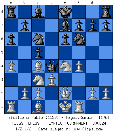 Last move : 1/2-1/2 2007 March 9 14:26:5 [Event "FICGS__CHESS__THEMATIC_TOURNAMENT__000024"] [Site "FICGS"] [Date "2007.02.05"] [Round "1"] [White "Siciliano,Pablo"] [Black "Fayol,Romain"] [Result "1/2-1/2"] [WhiteElo "1159"] [BlackElo "1176"] 1.e4 c5 2.f4 d5 3.Nf3 dxe4 4.Ng5 Nf6 5.Bc4 e6 6.Nc3 Qd4 7.Qe2 a6 8.a4 Bd6 9.Rf1 Nc6 10.Ngxe4 Be7 11.d3 1/2-1/2 Sicilian : Grand Prix attack This chess game ended in a draw. Follow this game move after move (download)Chess is a matter of delicate judgment, knowing when to punch and how to duck. (Bobby Fischer) Das Schach ist nichts für kleine Geister, es beansprucht einen vollen Mann, der sich nicht sklavisch an das Überlieferte hält, sondern selbständig die Tiefen des Spiels zu ergründen sucht. (Wilhelm Steinitz) A la fecha, Fischer esta simplemente un nivel arriba de todos los mejores jugadores de Ajedrez del mundo. (John Jacobs) Je menace de comprendre la position. (Anonyme) Players are not good because they find tactics, it is about the way to find the positions in which those tactics are hidden. (Luc-Olivier Leclerc)