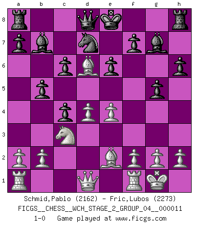 Last move : 1-0 2013 October 2 22:58:37 [Event "FICGS__CHESS__WCH_STAGE_2_GROUP_04__000011"] [Site "FICGS"] [Date "2013.07.30"] [Round "1"] [White "Schmid,Pablo"] [Black "Fric,Lubos"] [Result "1-0"] [WhiteElo "2162"] [BlackElo "2273"] 1.d4 d5 2.c4 c6 3.Nf3 Nf6 4.Nc3 e6 5.Bg5 h6 6.Bh4 dxc4 7.e4 g5 8.Bg3 b5 9.Be2 Bb7 10.O-O Nbd7 11.Ne5 Bg7 12.Nxd7 Nxd7 13.Bd6 1-0 QGD Slav : 4.Nc3 Kingside Castling by player White (move 10) Player White won this chess game. Follow this game move after move (download)An attack on the wing should be met by play in the center. (Nimzovitch) Garry Kasparov war erst in der Großmeister-Organisation GMA, dann in der Profischach-Vereinigung PCA, zum Schluss kehrte er wieder in den Schoß der FIDE zurück. Aber gut, manche Leute sind flexibel (Viswanathan Anand) Por la belleza de sus partidas, la claridad de su juego y lo brillante de sus ideas, Fischer se creó el mismo como un artista de la misma estatura como Brahms, Rembrandt y Shakespeare. (David Levy) Nous vivons dans un monde échiquéen : chaque jour qui passe est un défi à relever. (Philosophe Sasha) Wisdom is the reward you get for a lifetime of listening when you'd have preferred to talk. (Doug Larson)